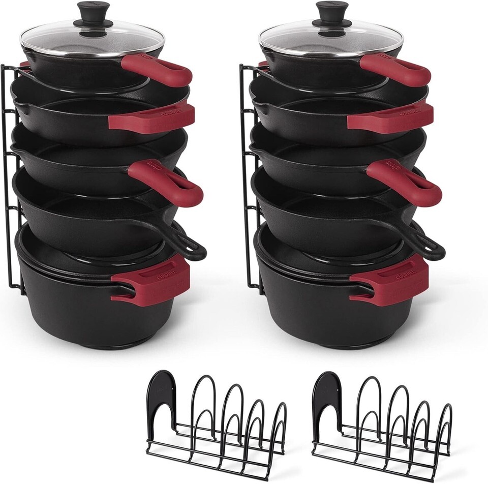 EXTRA LARGE TO FIT A DUTCH OVEN: This extra large version conveniently fits a dutch oven pot on the lowest rack. It's heavy duty construction is designed to hold even your heaviest cast iron pans, the strong metal ensures your pan organizer will be a investment. Durable and built to last, this rack can handle anything!