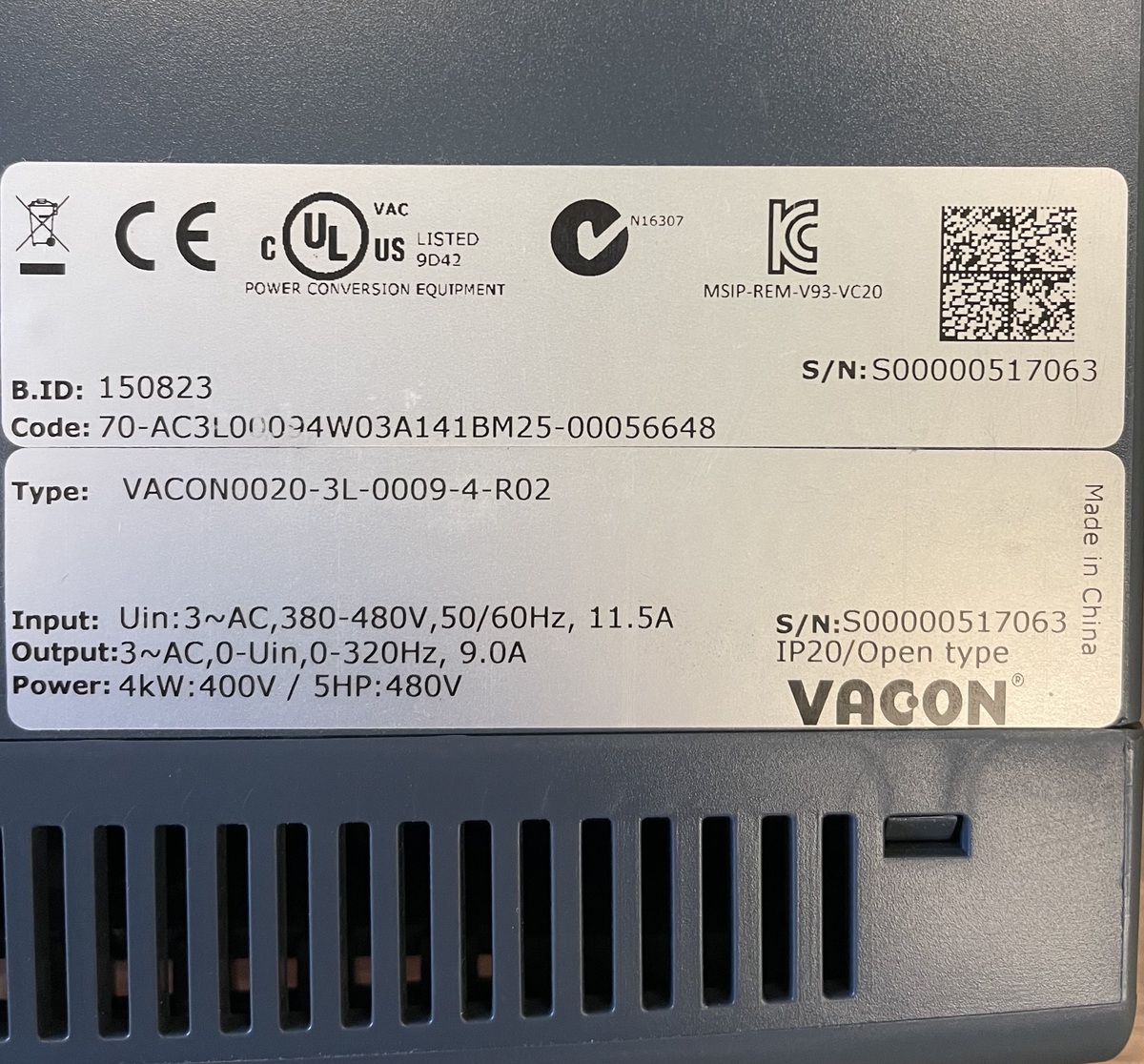 NEW IN BOX VACON (DANFOSS) 20-3L-0009-4-R02 VFD 3ฮฆ IN/OUT 5 HP 9.0A 480 VAC