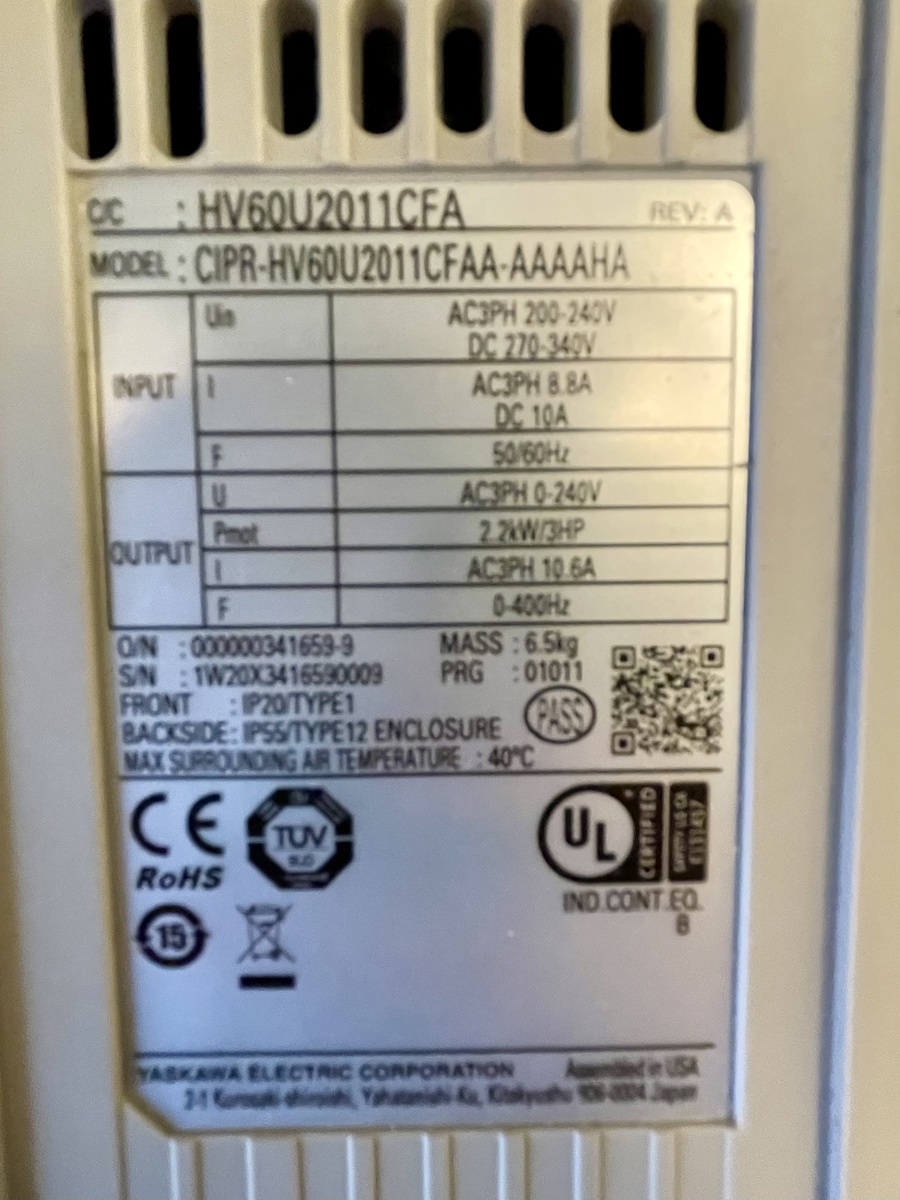Yaskawa HV60U2011CFA (HV600) Vfd 3Φ IN/OUT and 16 similar items