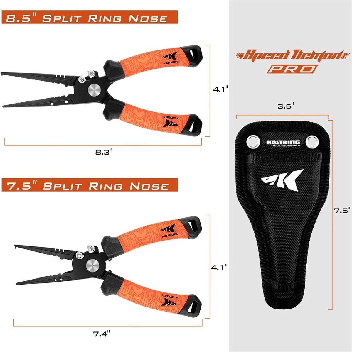 Non-Slip Handle ? The SuperPolymer handles provide comfort and control. This soft grip handle and spring loaded jaws allow for easy one hand use without worrying about your pliers slipping out of your hands. A custom molded sheath with belt clip ensures your investment is protected from normal wear and tear, and the coiled lanyard ensures your pliers don?t fall overboard! Speed Demon Pro Fishing Pliers are available in straight nose plier and a split ring plier nose designs.