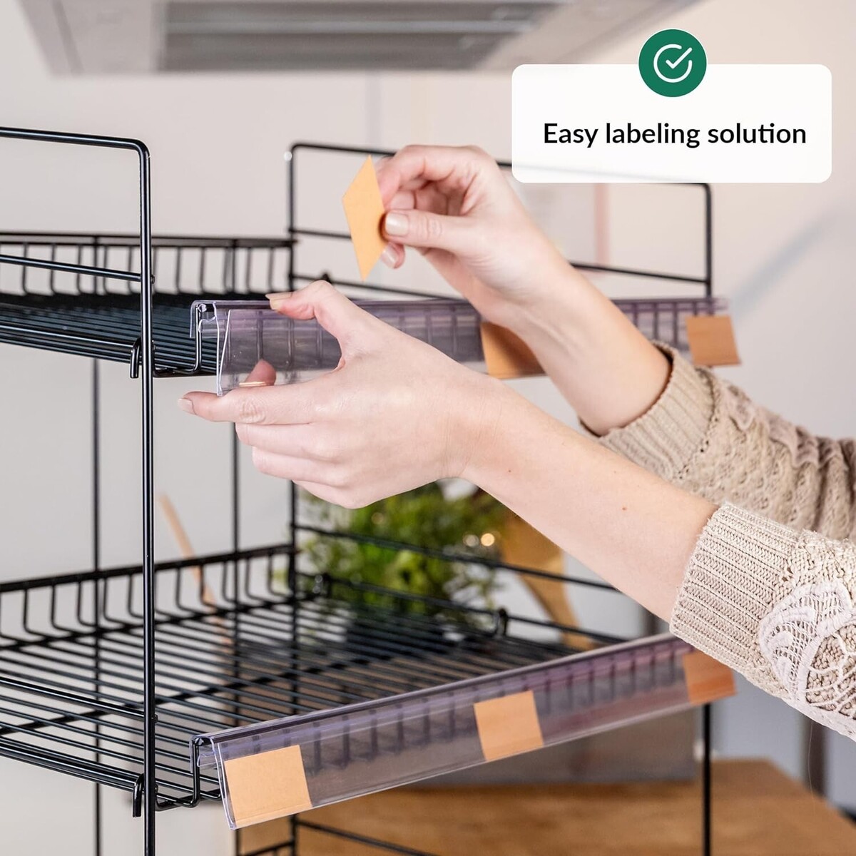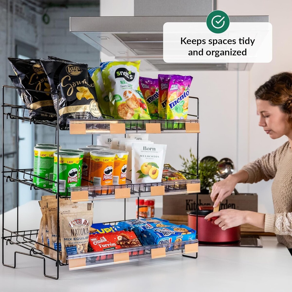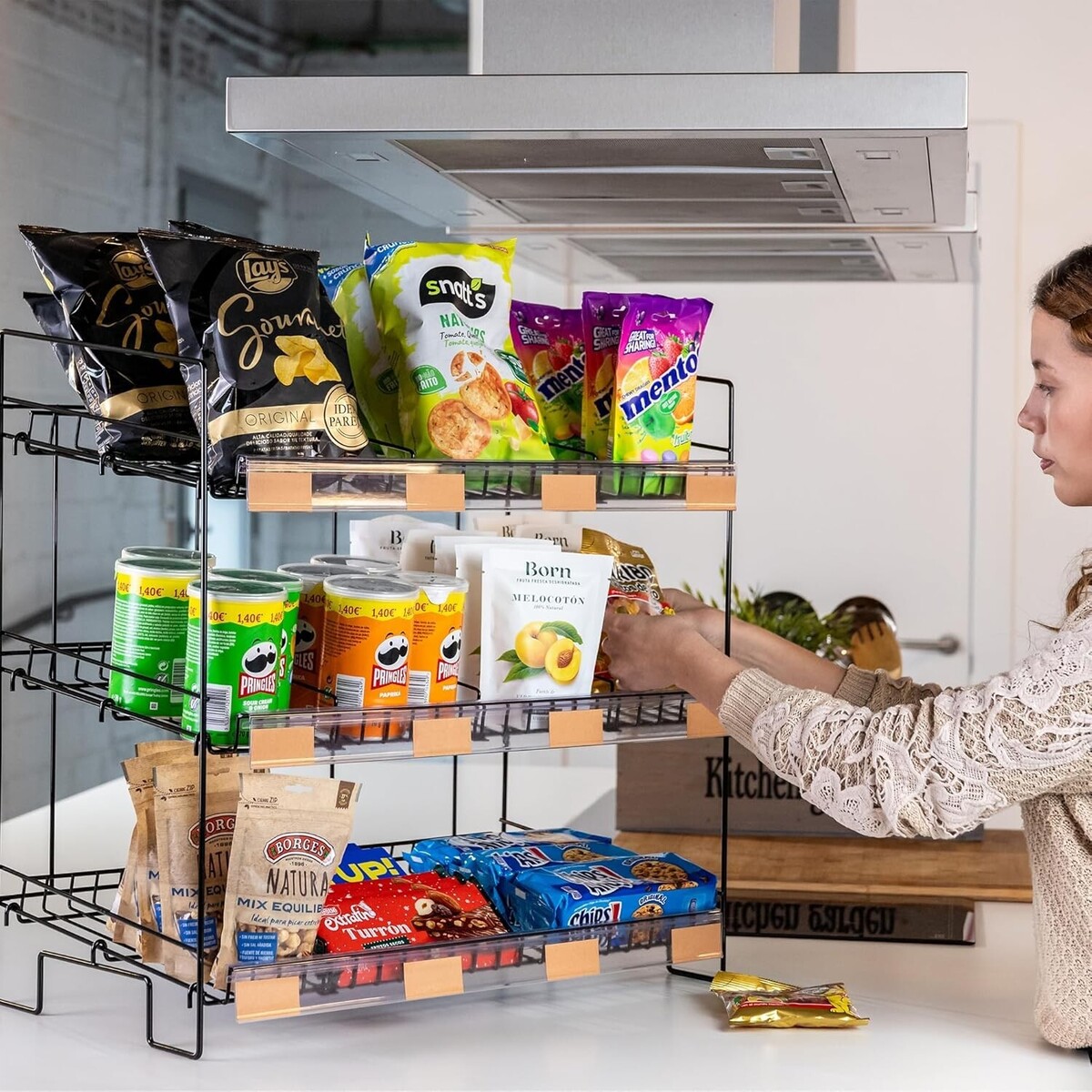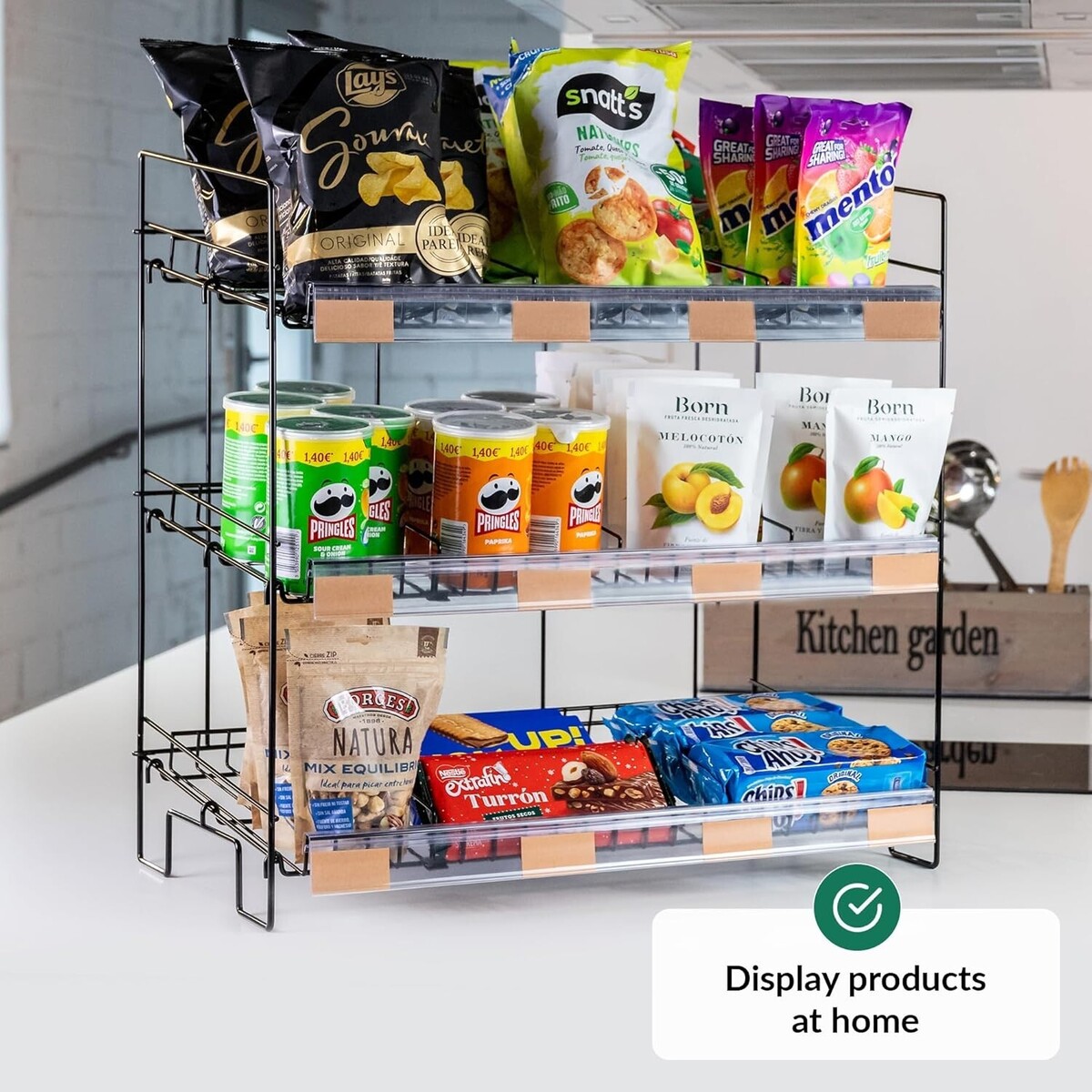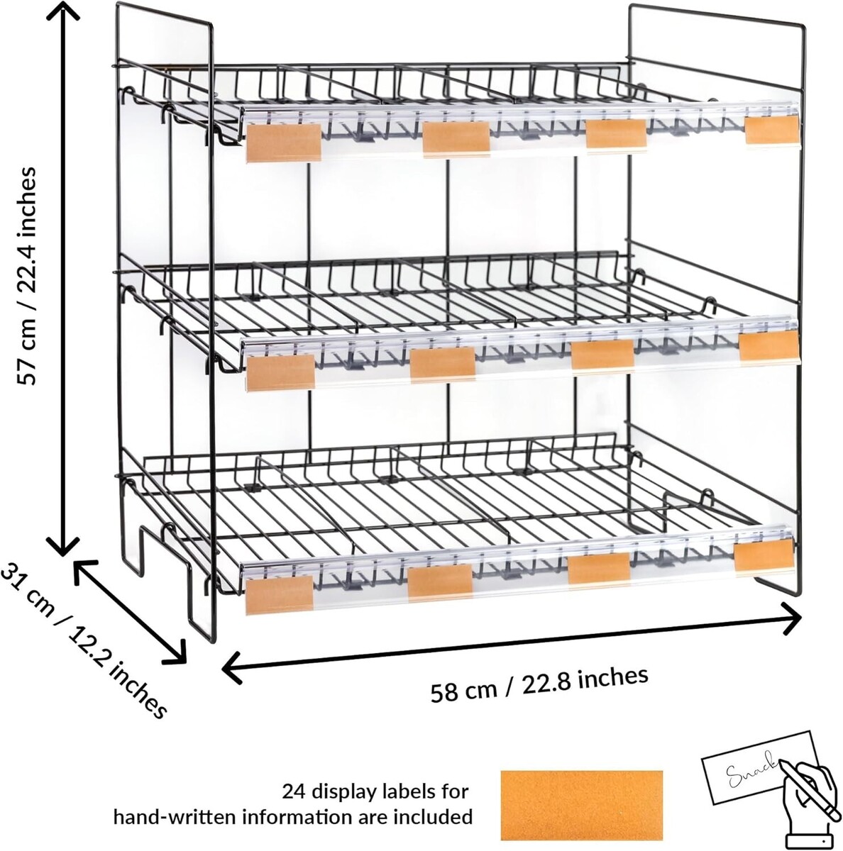?ATTRACT MORE CUSTOMERS?The eye-catching display snack rack comes with customizable labels to easily display your product names and prices. Even better, you can attach snack bags on the sides with the pegs!