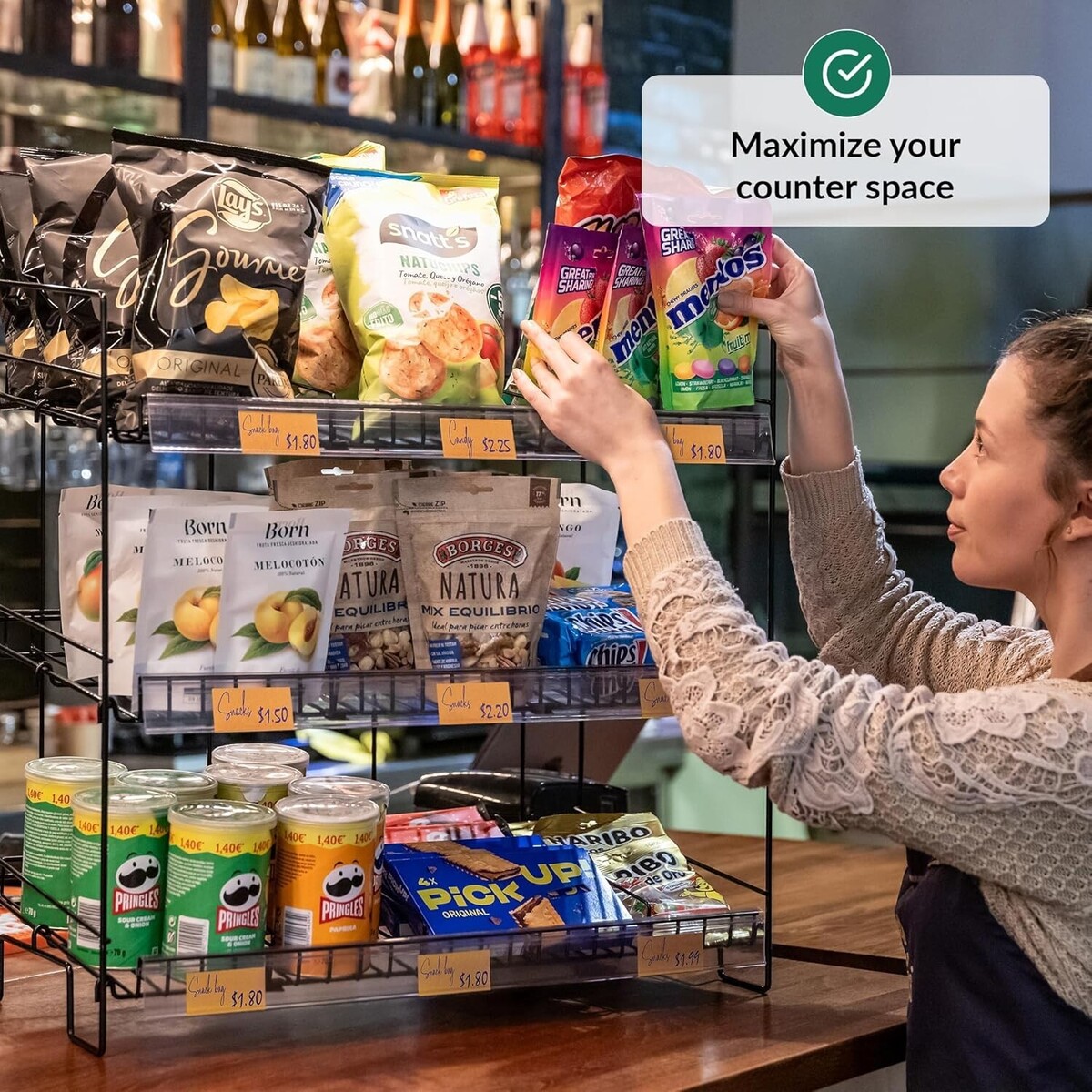 ?MAXIMIZE YOUR COUNTER SPACE?Make the most out your counter space with our compact candy display rack. The tiered shelves create a cascading effect that makes it easy for customers to see all the available options, while taking up minimal space.