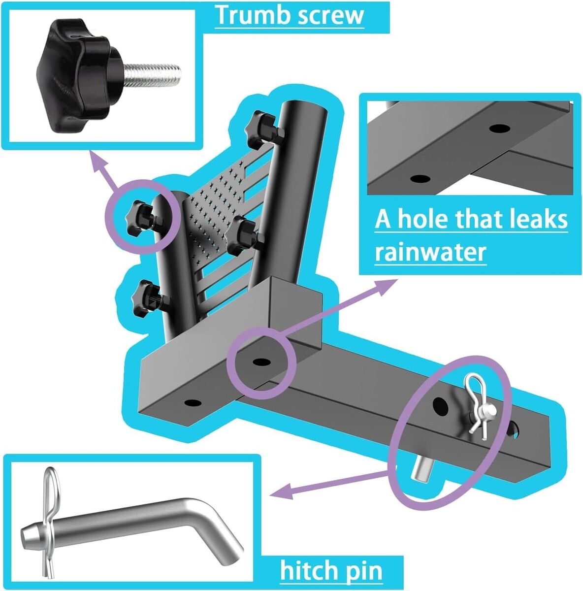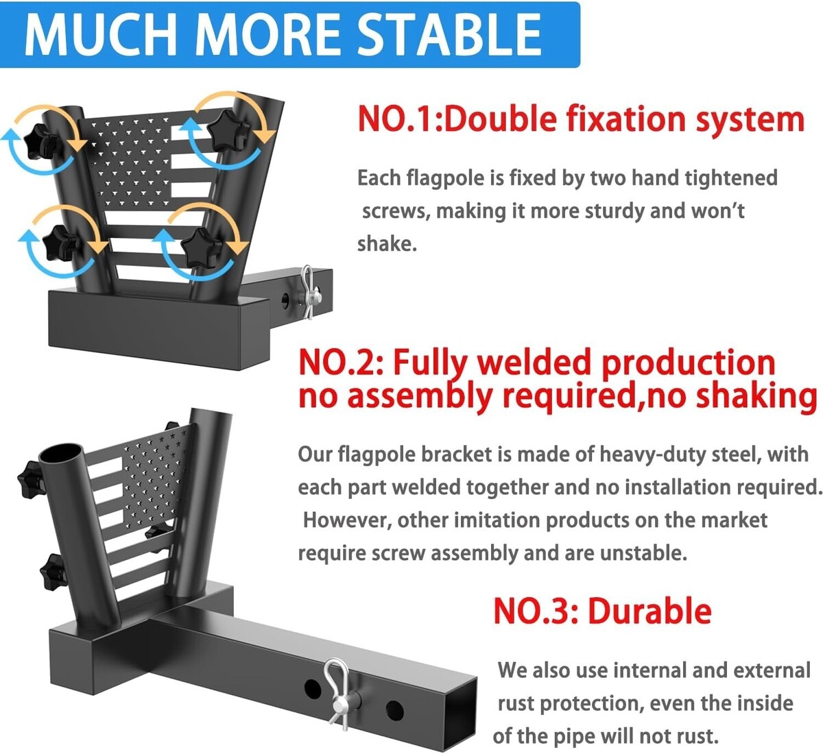 ?Universal Fit for Any 2'' Hitch Receiver? - It widely suits to all poles up to diameter, and Flag Pole Hitch Mount Perfectly compatible for any vehicle with standard 2" hitch receiver, great for Jeep, SUV, RV, Pickup, Truck, Camper, Trailer, etc. The flagpole frame is made of Heavy duty metal and Surface treatment is Electrophoresis Black Powder Coated. It has good rigidity and stability, sturdiness and durability.