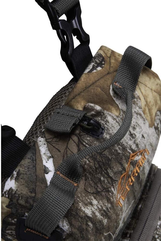Enhance your outdoor experience with the Terrain? Mesa Deluxe Bino Case with Harness in Realtree Edge. Designed for quiet and easy access, this binocular case features a silent magnetic closure, allowing you to retrieve or store your binoculars without noise. The case is crafted from soft, silent fabric to protect your gear, and includes a dedicated rangefinder pocket, mesh pockets, and a back zippered pocket for additional accessories. The fully adjustable harness ensures a comfortable fit, making it perfect for all-day treks. Compatible with most binoculars up to 10x42 in size.