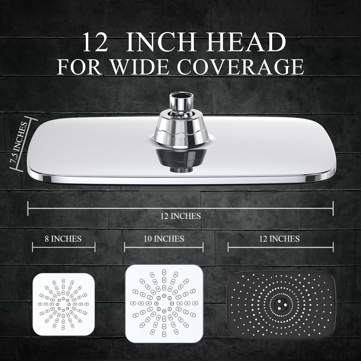 Wide Coverage Style. Our large 12-Inch wide shower head allows for full body water coverage for your most satisfying shower yet. Enjoy the feeling of true luxury with our generously sized design that never leaves you in the cold