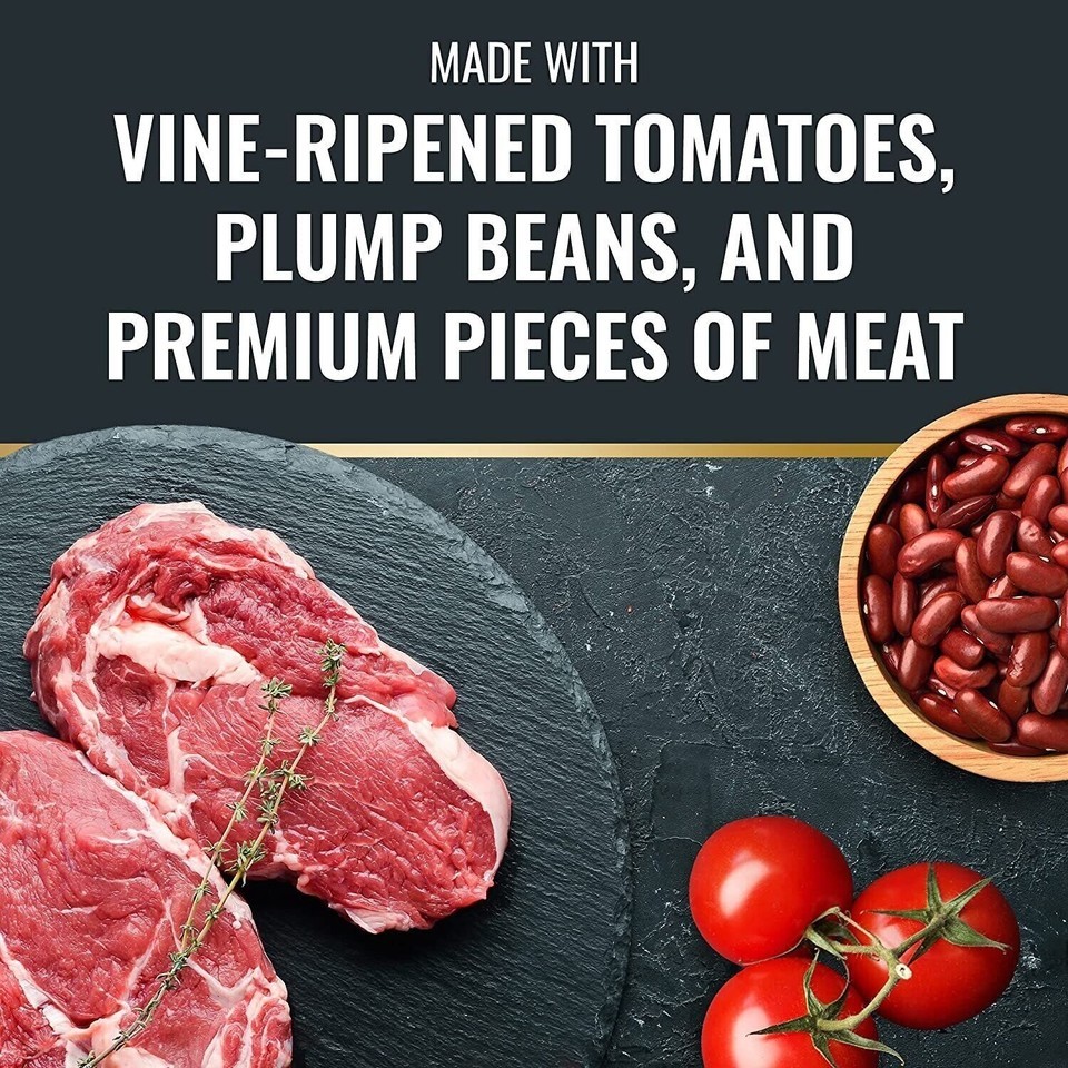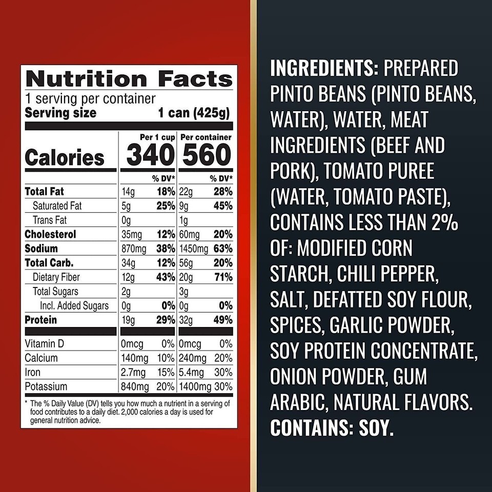'PREPARED PINTO BEANS (PINTO BEANS, WATER), WATER, MEAT INGREDIENTS (BEEF AND PORK), TOMATO PUREE (WATER, TOMATO PASTE), CONTAINS LESS THAN 2% OF: MODIFIED CORN STARCH, CHILI PEPPER, SALT, DEFATTED SOY FLOUR, SPICES, GARLIC POWDER, SOY PROTEIN CONCENTRATE, ONION POWDER, GUM ARABIC, NATURAL FLAVORS.'