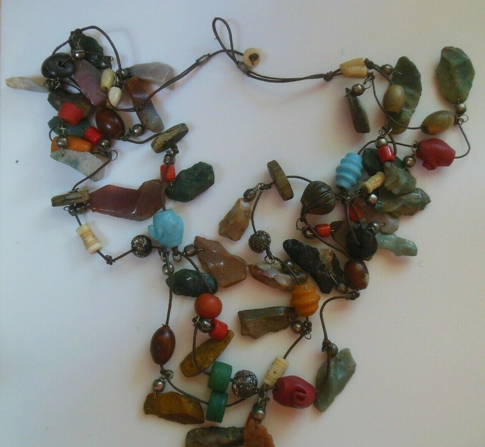 Double Strand Long Heavy Multi-color Stone/Bead Trade Beads on Leather Cord
