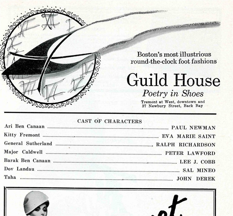 On Stage Program from the Saxon Theater in Boston, Massachusetts in January 1961. Otto Preminger's Exodus. starring Paul Newman, Eva Marie Saint. Ralph Richardson, Peter Lawford, Lee J Cobb, John Derek and Sal Mineo