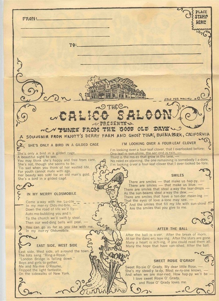 A large 2 sided song sheet, drinks menu and Entertainment Vaudeville Show Program and mailer. Knott's Berry Farm Calico Saloon Tunes From the Goo Old Days Drink Menu Vaudeville Show