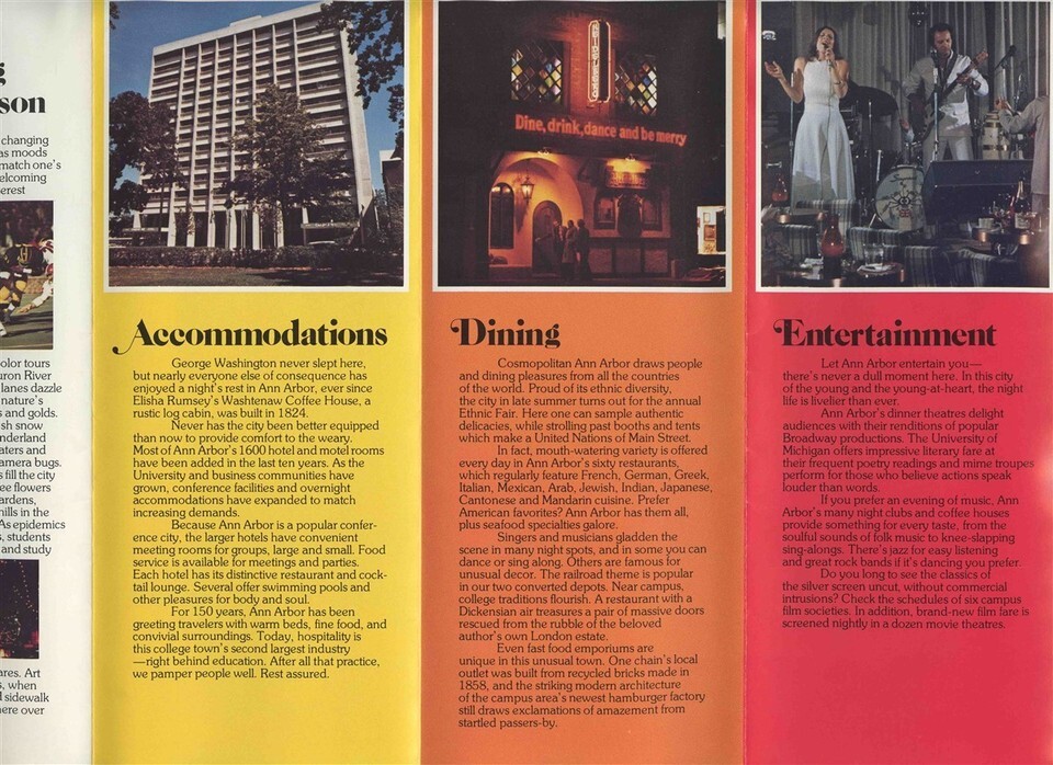 A full color 16 panel fold out brochure with great photos, area map and descriptive text. With information on Accommodations, Dining, Entertainment, Cultural Activities, Shopping and more. Ann Arbor Michigan Brochure People Are Learning All About It