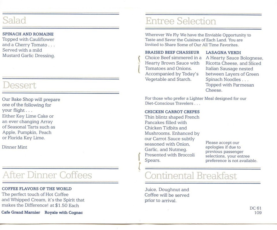 TWA Trans World Airlines International Coach Class Menu