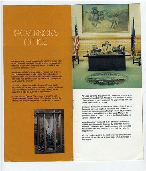 A 16 page booklet on the KANSAS Office of the Governor and Cedar Crest Executive Mansion done during the administration of Governor Robert Bennett in the late 1970's. In fine condition. With many photos with history and detailed information on the rooms in both the Governor's Office and in the Executive Mansion.