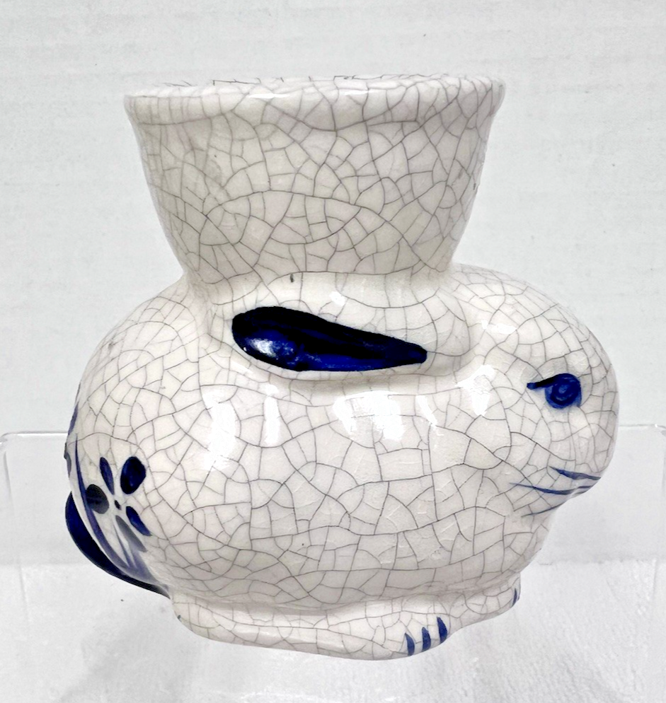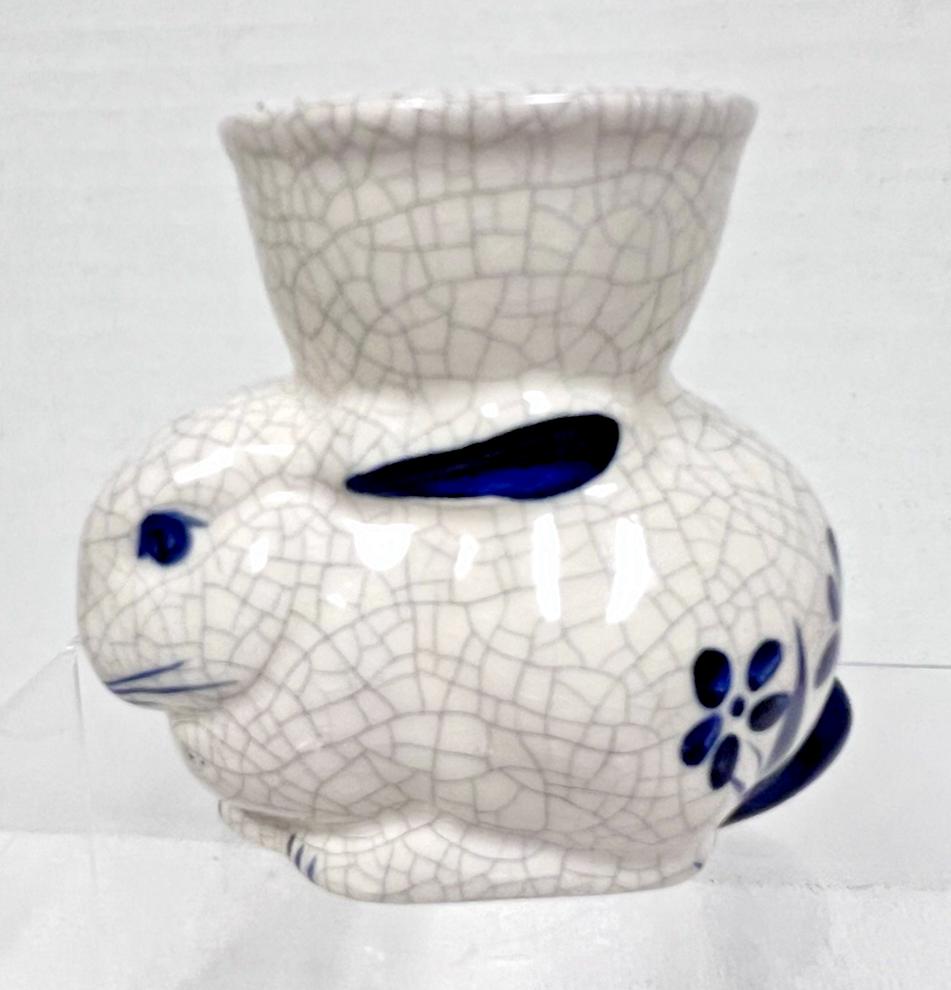 Vintage Dedham Pottery Egg Cup Holder Bunny Rabbit Handmade Collectible measures approx. 3 1/4" tall and 3 3/8" long. Very good used condition, no damage. See pictures.