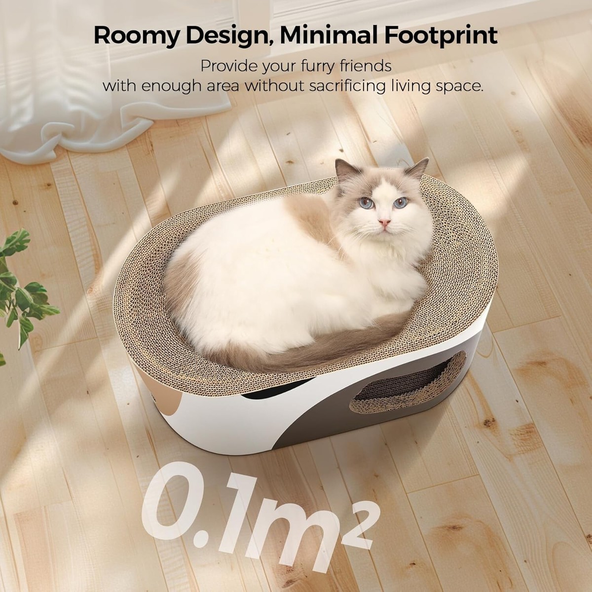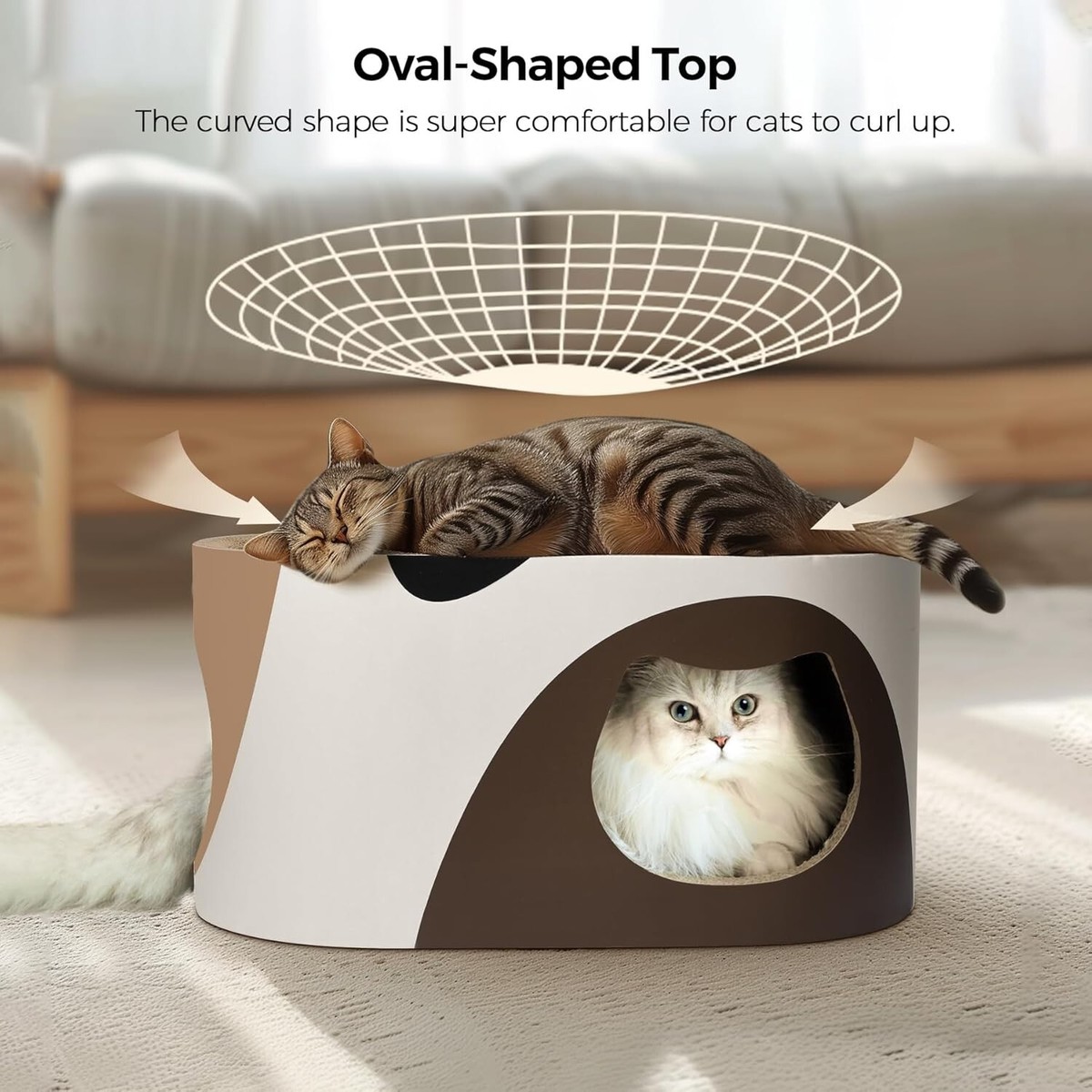 [Ingenious Concave Design on Top] A slightly concave oval-shaped design fit cats' spine better when they sleep on it, providing them a comfortable place to curl up for a good nap in a rosy afternoon or to scratch and hang out.