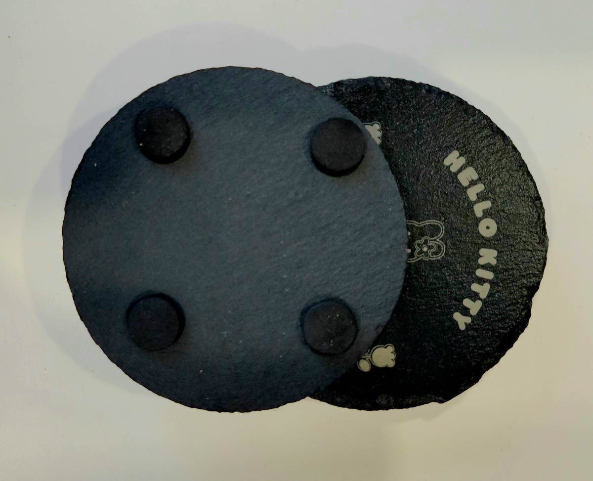 Set of 4 Round Hello Kitty Coasters Laser engraved (not just printed) onto black slate stone then clear-coated for a great look. Standard sized coasters with protective bumpers on reverse.