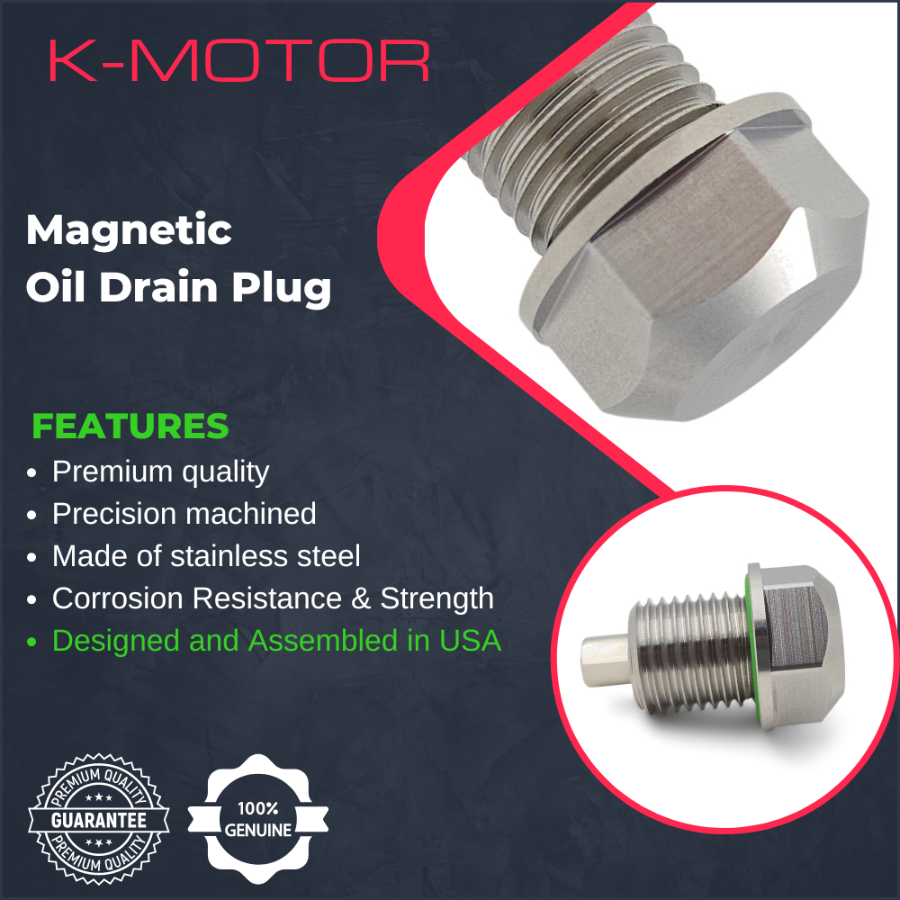 K-Motor Performance oil drain plugs are made of high quality stainless steel. They are precision machined and assembled with the highest quality materials. This plug is designed with a leak-proof washer and a magnet to keep harmful metal shavings out of the engine.