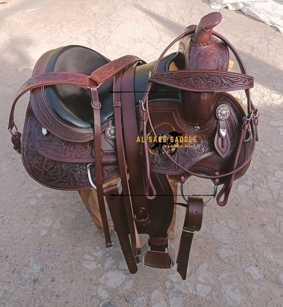 This premium leather Western brown horse trail pleasure show saddle is handmade in India. The traditional saddle design is suitable for all horses and is available in sizes ranging from 10 to 18 inches. The comfortable ride and high-quality materials make it ideal for barrel racing and outdoor sports, providing a seamless riding experience for enthusiasts looking for a durable and stylish saddle for their equine partner.