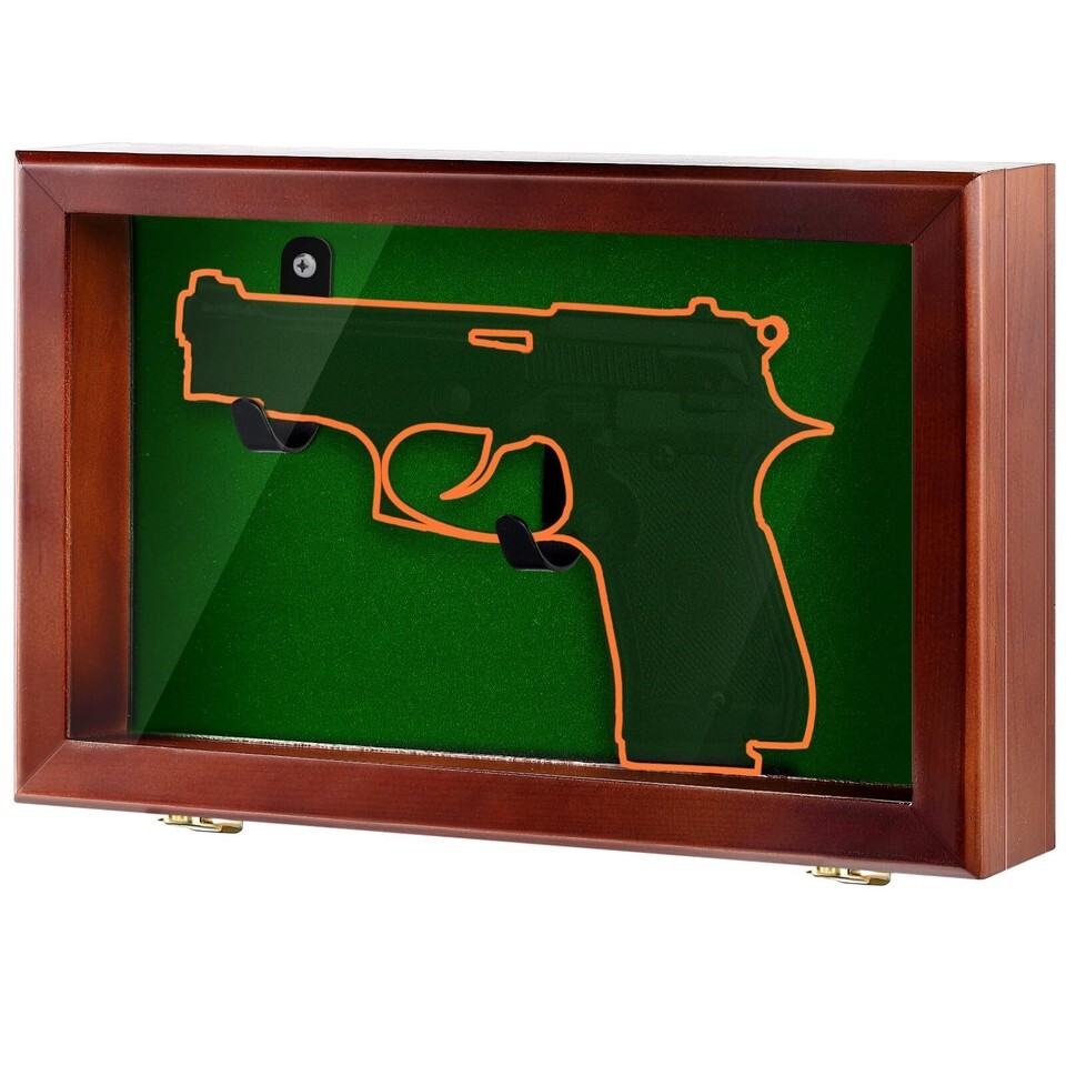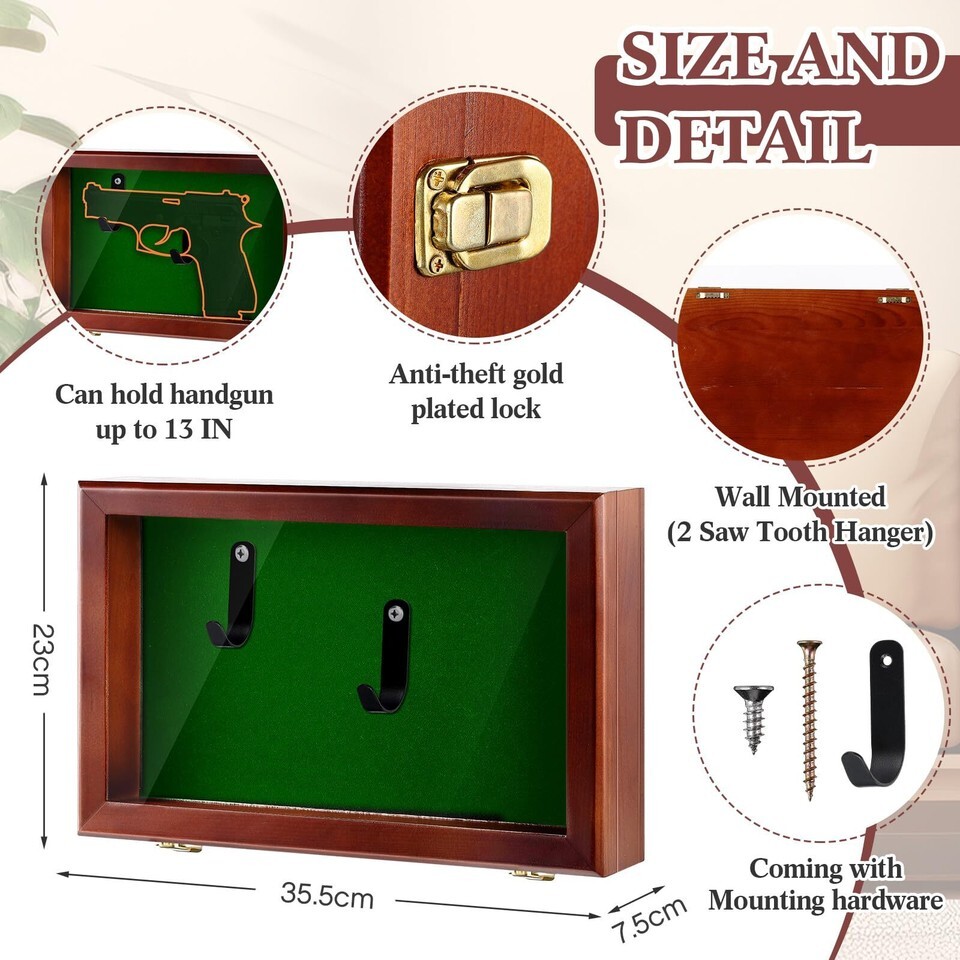 Quality Material Construction: experience reliable durability with our wall mount wooden pistol display case, meticulously crafted from resilient pinewood, lightweight and sturdy, the box is in reddish brown color with interior anti scratched and soft military green liner, epitomizing both elegance and practicality, it stands the test of time, keeping your precious guns presented in style and safety