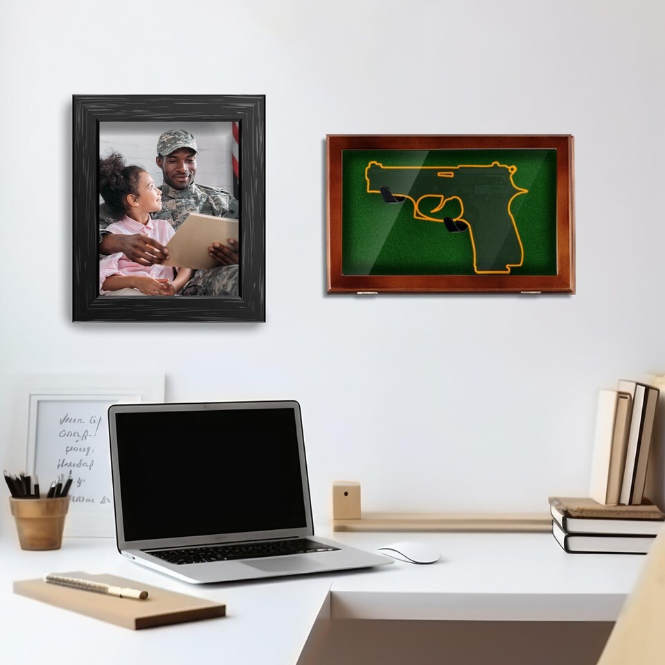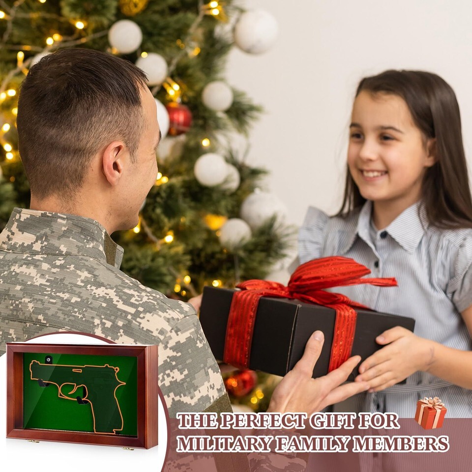 Wall Mountable Gift: this gun shadow box display case is easily wall mountable with metal hanging brackets on the back, it makes for an ideal gift because of its impressive presentation and practical features, and you can apply them to showcase pistols, revolvers, coins, watches, trophies, statuettes, wines and other items