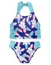 Beautiful colors of the many flowers in this swimsuit are offset by royal blue double straps that crisscross at the back.