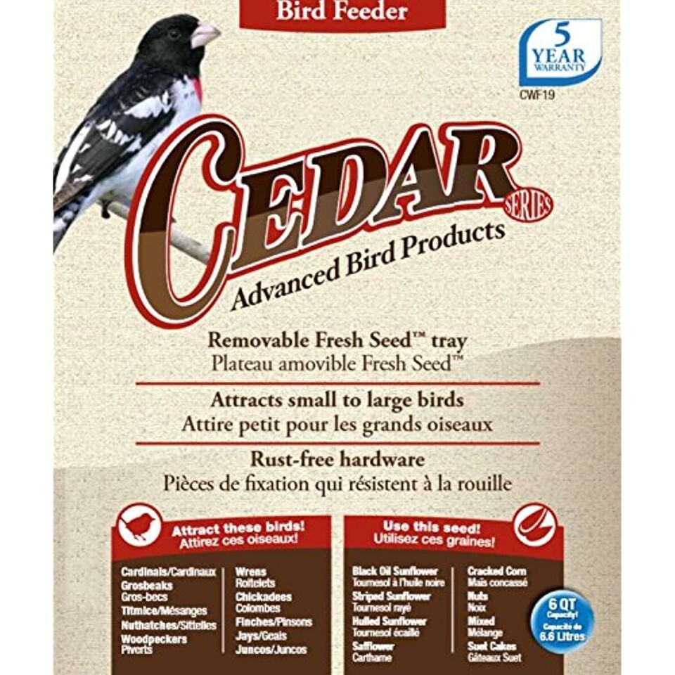 Nature's Way Bird Products CWF19 Cedar - 6QT Hopper Bird Feeder with Suet Cages is made with premium cedar so it's naturally insect and rot resistant; ours is treated with a water-based, protective stain. It's designed to accommodate 6 full quarts of various seed mixes including sunflower seeds, mixed seeds and peanuts, along with two vinyl-coated wire mesh suet cages. This particular feeder design offers a wide opening for easy filling and no spilling, then diverts seed to the feeding area, giving birds easy access. The durable, rust-free stainless steel Fresh Seed Tray easily lifts out for cleaning and keeps seed fresh - preventing mold and bacteria growth - by allowing water to drain and air to flow freely. Extra spacing accommodates large birds like Cardinals and Jays. It attracts Cardinals, Grosbeaks, Titmice, Nuthatches, Chickadees, Finch, Jays, Juncos and Woodpeckers. The stay-clear, crack resistant weather shield and windows allow you to see the level of seed in the feeder and see through the feeder for better bird viewing. Including the vinyl-coated steel hanging cable, all hardware is rust-free and covered by a 5 Year Manufacturer's Warranty. Our innovative design technology is combined with superior quality for ease-of-use and long-lasting durability.