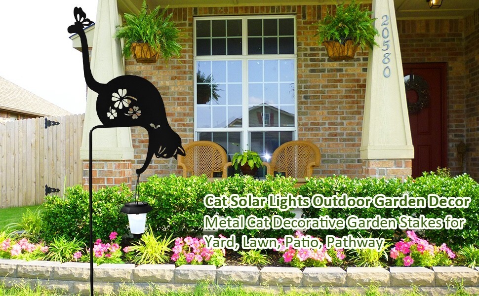 Cat lovers will adore this stake. The metal decorative stake features the silhouette of a friendly cat holding a solar lantern and is specially designed with a four-leaf clover pattern for good luck! The curious cat is handcrafted from high quality metal and coated with a waterproof coating. This solar cat yard stake sign is sturdy and durable even in the sun and rain without worrying about fading and rusting easily. The metal stake can be anchored anywhere in your yard or garden.