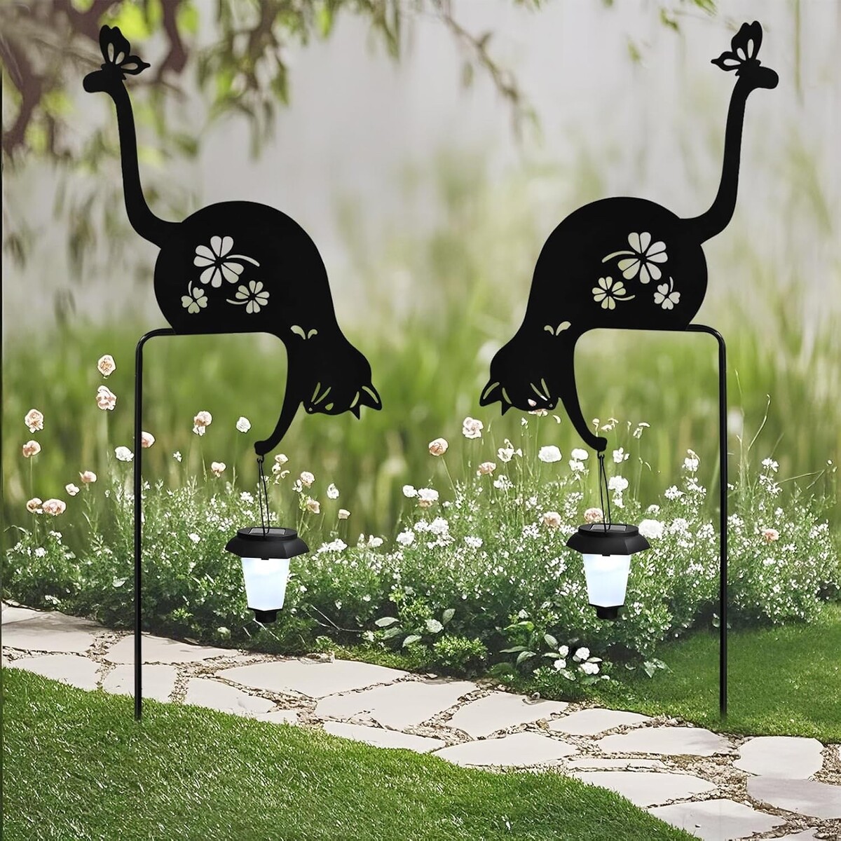 Solar Powered Yard Stake Cat Silhouette Holding Lantern Outdoor Garden Art Decor