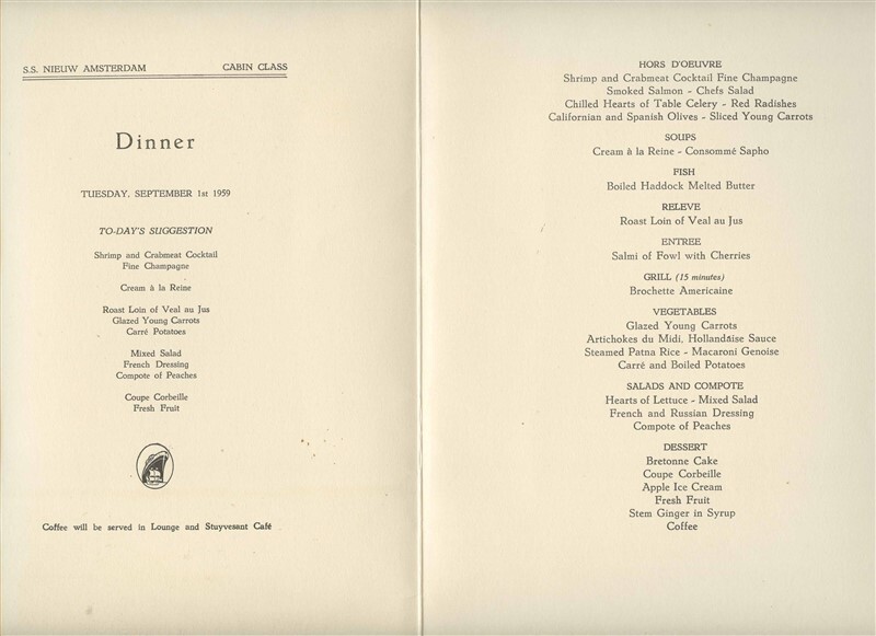 Holland America Menu 1959 Nieuw Amsterdam Fen Province Noord Brabant Holland
