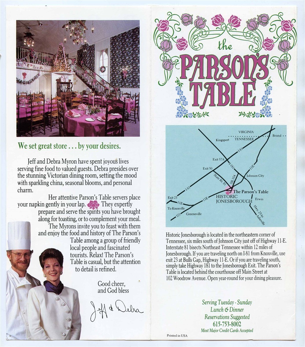 A full color 6 panel fold out brochure. The Parson's Table Restaurant Brochure . Located in Jonesborough Tennessee