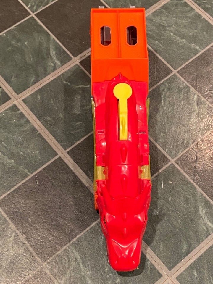 The dragon launcher has a lever on the top that when pushed, the dragon's mouth will open and a car will launch out