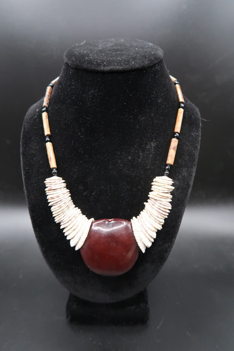 Vtg Puka Shell Statement Necklace w/ Red Gourd Center Bead Tribal Look 14"