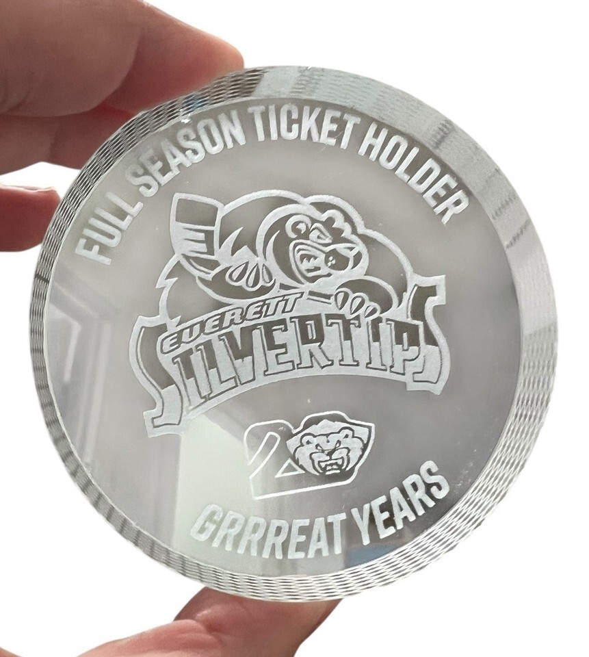 This is a commemorative puck for the Everett Silvertips, a major junior ice hockey team based in Everett, Washington.