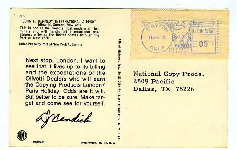 A John F Kennedy International Airport Advertising JFK Postcard. Idlewild Queens New York Olivetti Dealer Advertising Mailed in 1971