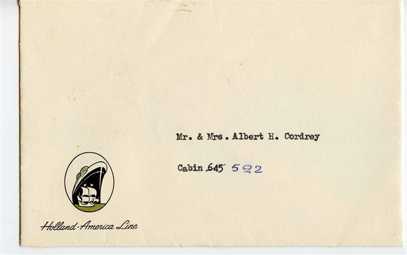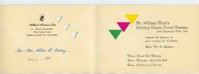 An interesting 4 page invitation with triangles cut in the cover to reveal different colors on an interior page. Plus the original H A L envelope. Holland America Line Cocktail Party Invitation from 1965 aboard the SS Nieuw Amsterdam . From a Cuyahoga Falls Ohio Travel Bureau. Measures about 6 1/4" x 4" when closed.
