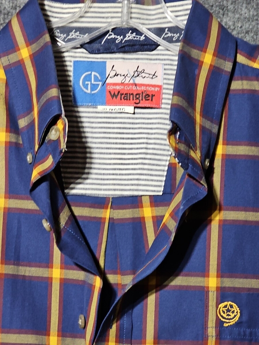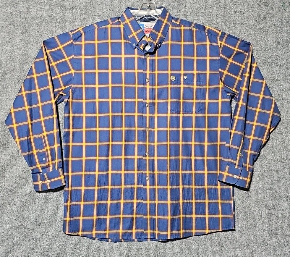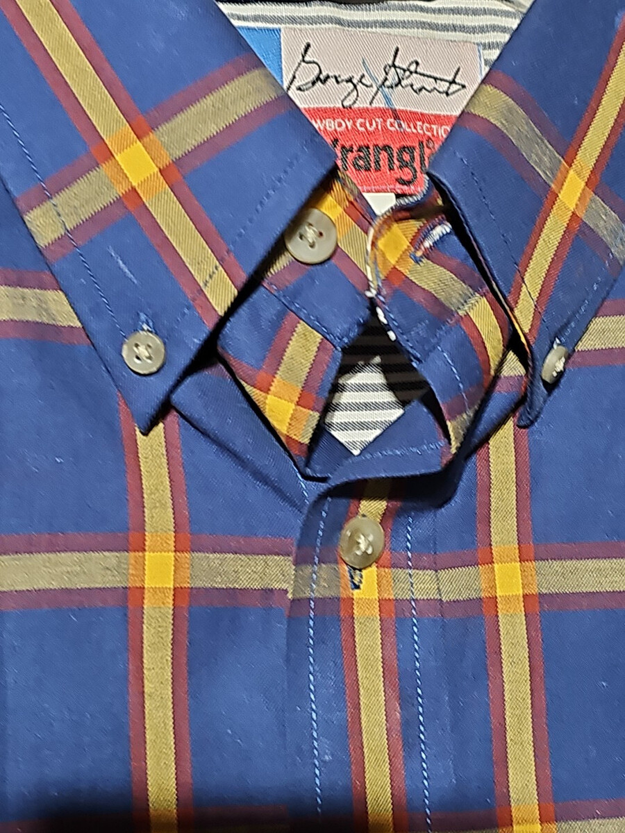 Upgrade your western wardrobe with this Wrangler George Strait Collection Western Shirt in Men?s XL. This long-sleeve button-down features a classic blue and yellow plaid pattern, making it perfect for casual, ranch, or country wear. Designed with Wrangler?s quality craftsmanship, this shirt offers durability, comfort, and timeless western styling.