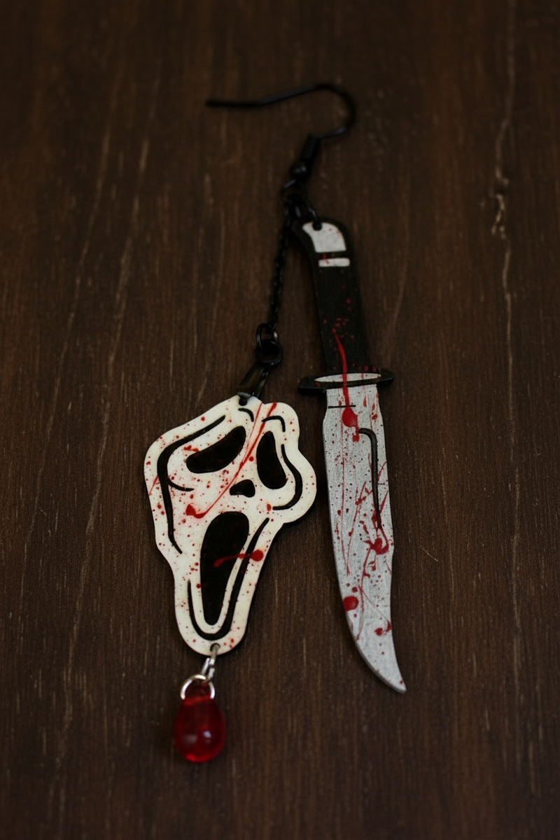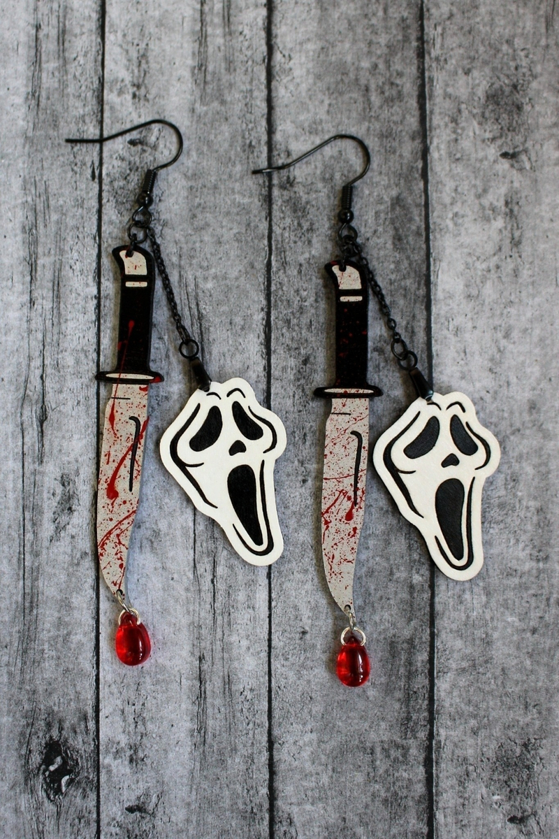 Unleash your inner horror aficionado with our Bloody Knife Ghost Earrings, a spine-tingling homage to the iconic movie. These chilling pieces of horror jewelry are masterfully crafted to capture the fear, complete with his signature menacing profile and a gleaming knife detail that punctuates the design. Perfect for Christmas, each earring is a terrifying testament to your love for the macabre, combining the eerie elegance of horror earrings with a touch of cinematic nostalgia. The lightweight materials ensure all-day comfort, while the striking design makes them perfect for any horror-themed gathering, Christmas gift for her, or a casual day out. Adorn your ears with these Ghost earrings and carry a piece of the suspense-filled saga with you, sparking conversations and maybe a scare or two. As stylish as they are sinister, these earrings are the ultimate nod to one of horror's most iconic villains. Many different styles to choose from. Do you want your mask white or bloody? Mask with Small Knife (4"), Mask and Knife (3.5"), Blood Bead Mask and Knife (3.75"), Mask and Blood Bead Knife (4")