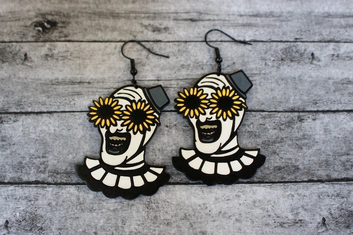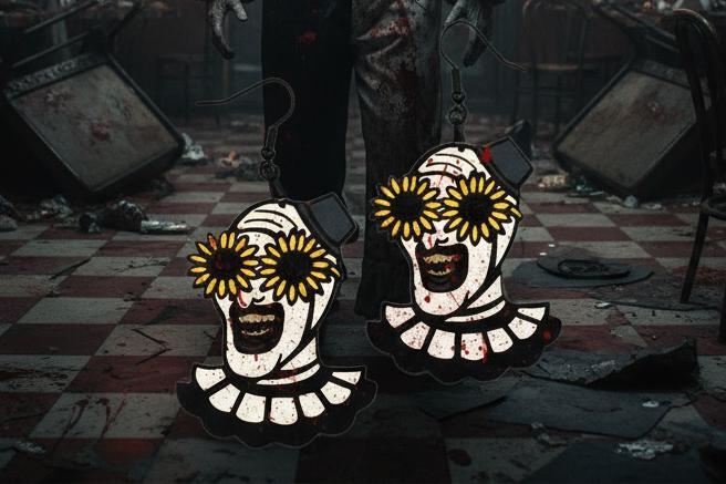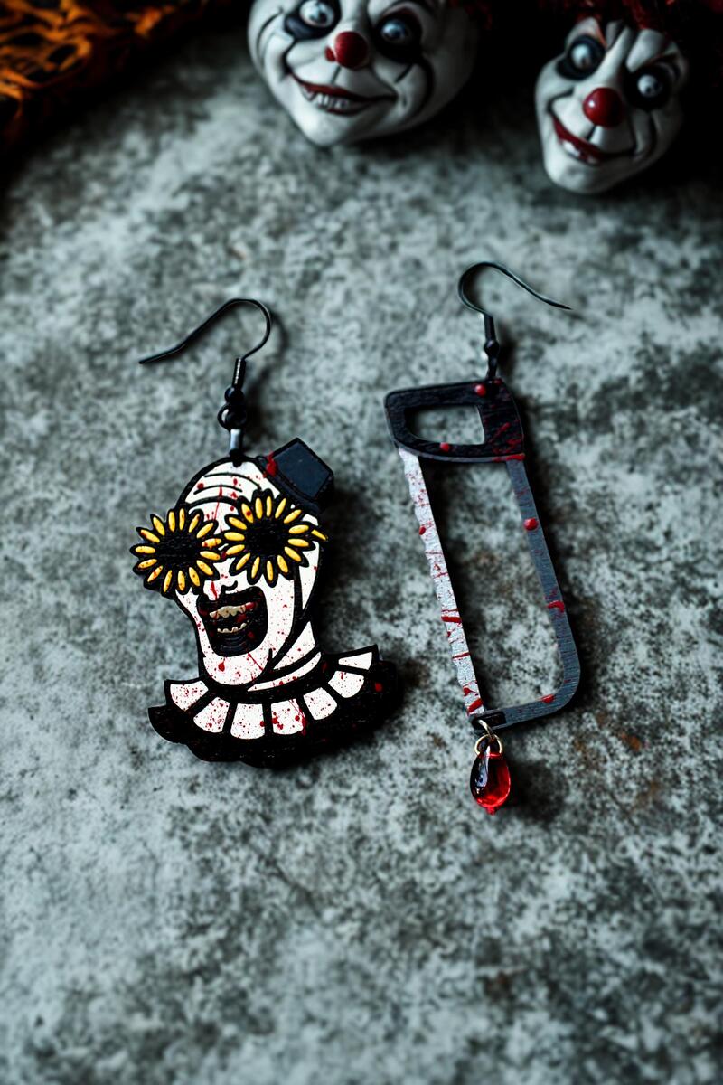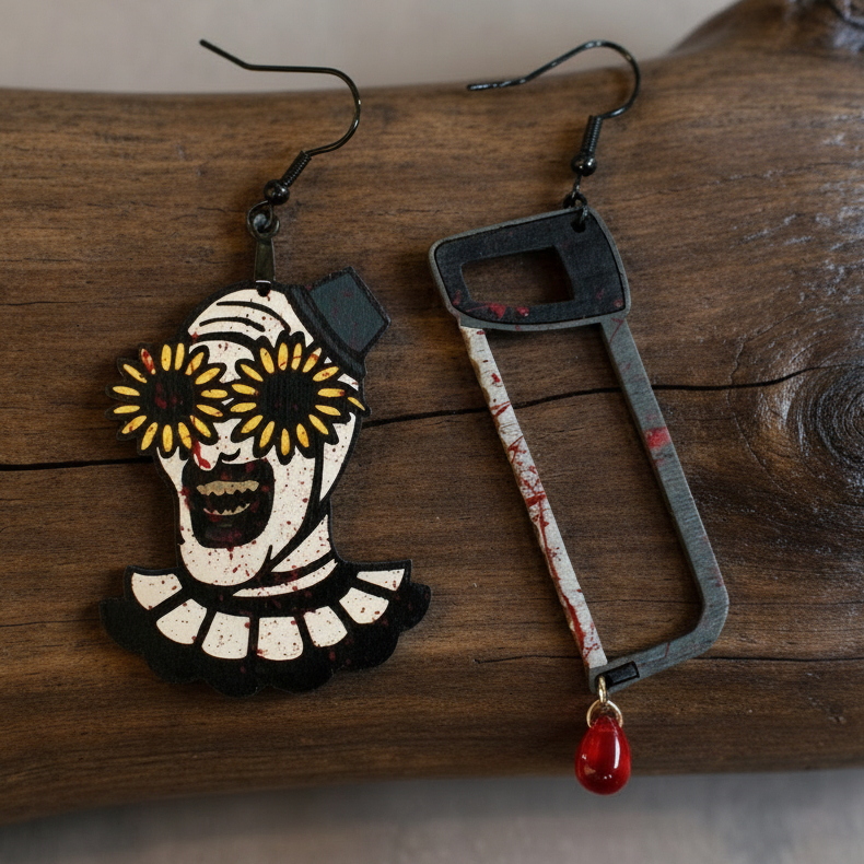 Transform your accessory collection with our gory bloody clown earrings, a chilling tribute to binge-worthy horror. Each piece is a masterpiece of handmade craftsmanship, echoing the eerie and iconic visage of this classic killer. The strikingly detailed design is captured in durable materials, adding an edgy, fearsome flair to your ensemble. While looking as though they're plucked straight out of a spine-chilling scene, rest assured, the hacksaw is optional, leaving only style to thrill. These earrings are more than just horror jewelry; they're a conversation starter, a bold statement, and a must-have for any enthusiast of the macabre. Whether you're heading to a Halloween party, need a Christmas Gift, Birthday gift, or simply want to keep your eerie spirit alive all year, these earrings meld perfectly with both subtle and bold fashion tastes. Wear them and let the whispers of terror resonate in your ears.