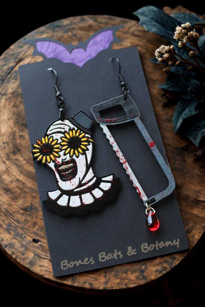 Bloody Clown Handmade Horror Earrings, Blood Drop Hacksaw Design, Spooky