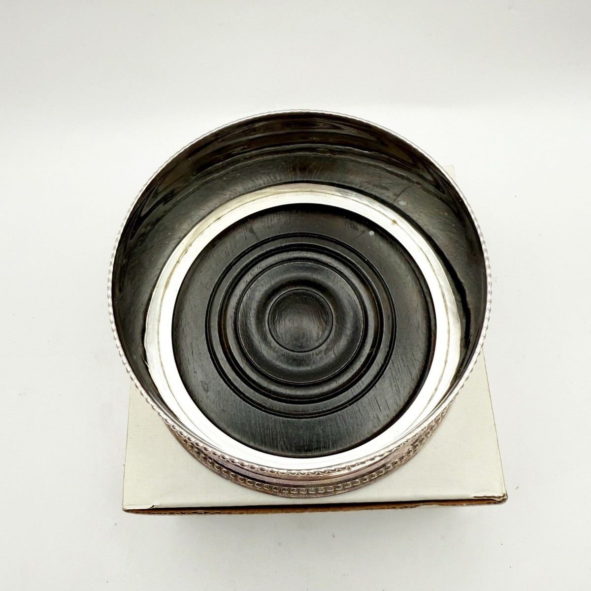 Silver plate shows minor tarnish. Needs cleaning. With original box. Box shows minor wear.