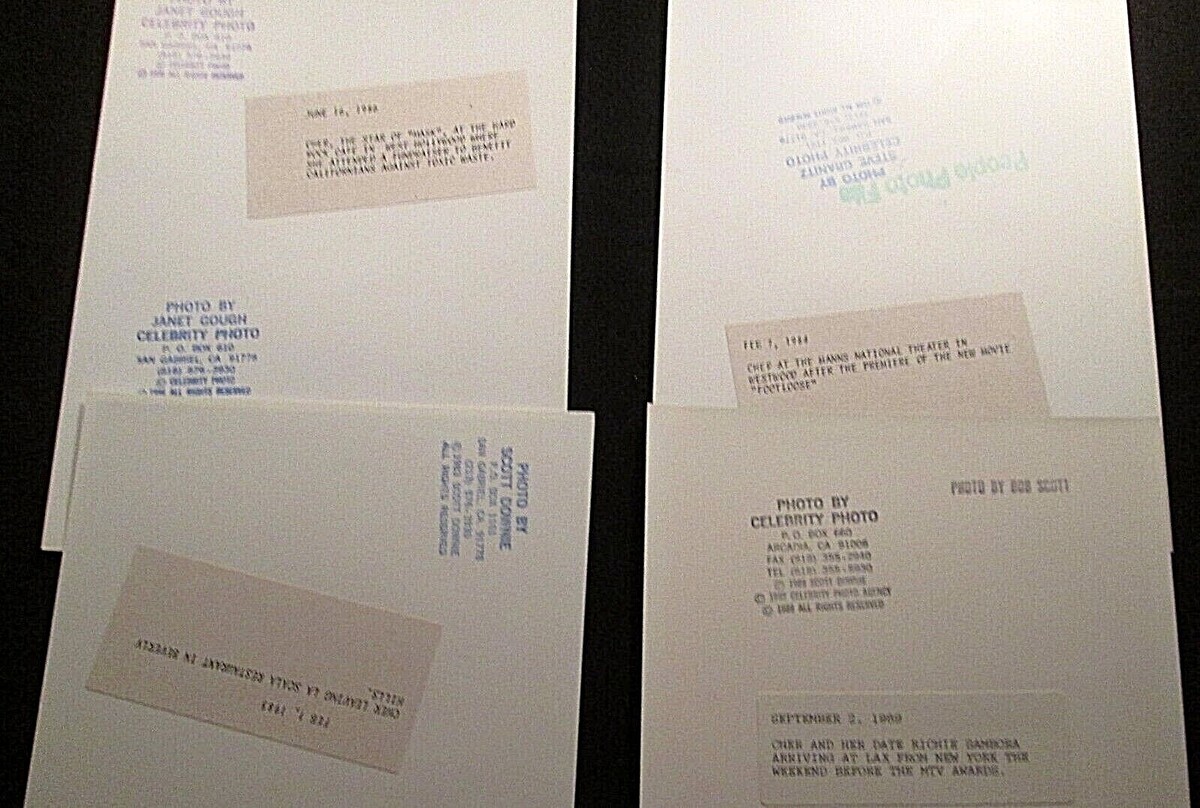 CHER: (ORIGINAL VINTAGE PAPARAZZI PHOTO LOT) CLASSIC CHER IN HER MANY FASHIONS (WITH INFO SNIPE ON BACK OF PHOTOS) PRICE PER LOT
