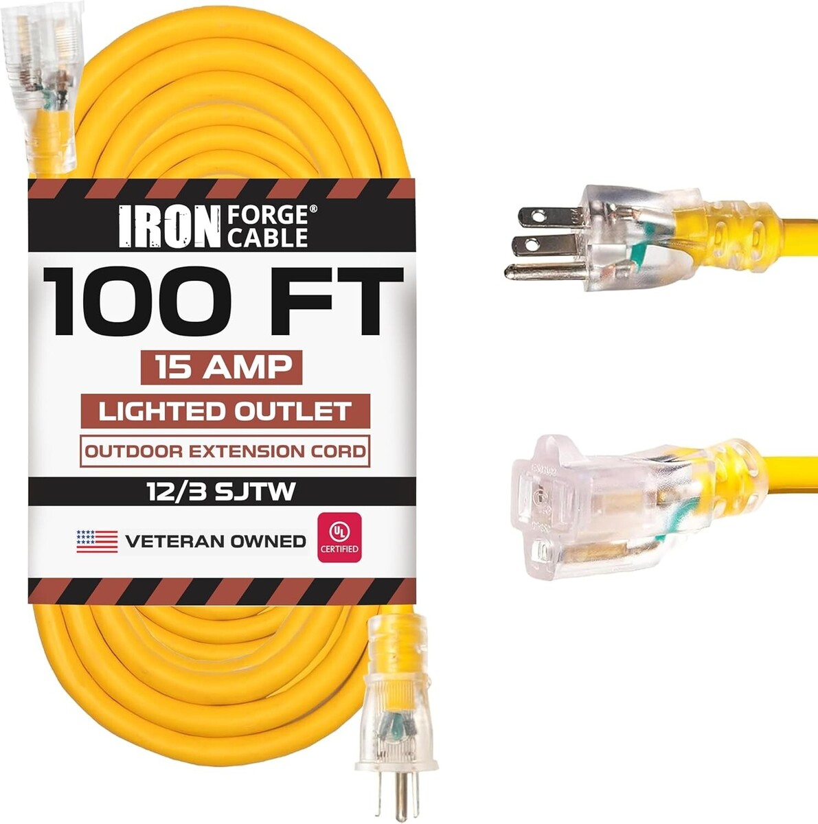 100 Foot Outdoor Extension Cord - 12/3 SJTW Heavy Duty Yellow 3 Prong Extension Cable, 15 AMP - Great for Garden and Major Appliances