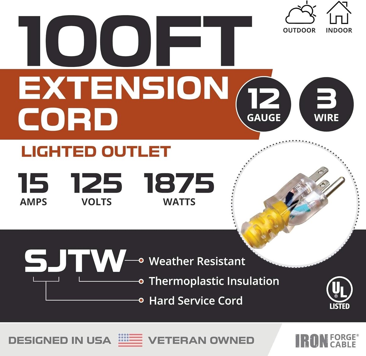 ENHANCED VISIBILITY FOR SAFER WORK SITE: The lighted end of this heavy-duty 15 amp extension cord indicates when the power is on, providing increased visibility. The bright yellow SJTW cord jacket reduces the risk of tripping over the cable while connected to electrical appliances.