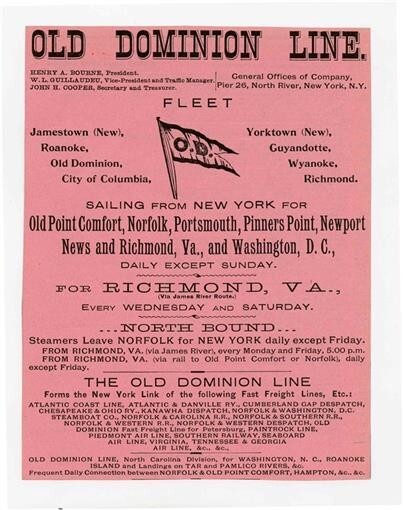 An Original 1890's Steamship Ad. An Original 1890's Original 1890's Old Dominion Line Ad from a Transportation Publication. This ad highlights the OD Fleet Flag and list of ships and the service from New York to Richmond, Virginia and other ports. Measures a bout 6" x 7 1/2".