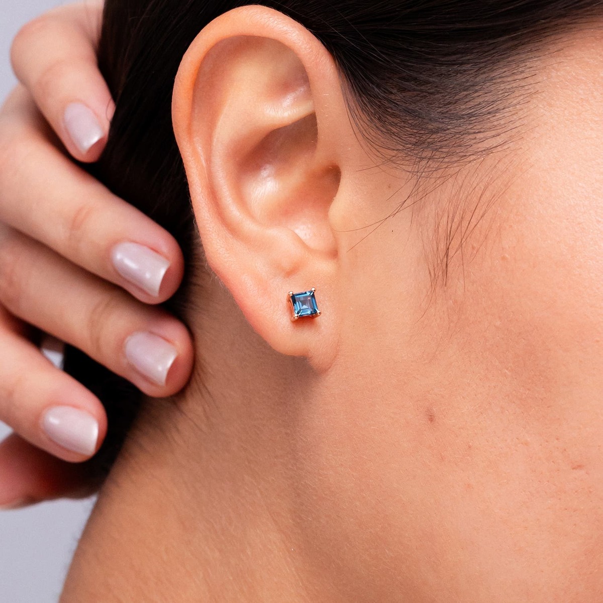 These classic London blue topaz stud earrings look simple and striking. The square London blue topazes are mounted in silver basket prong settings and draw the eye with their mesmerizing hue.
