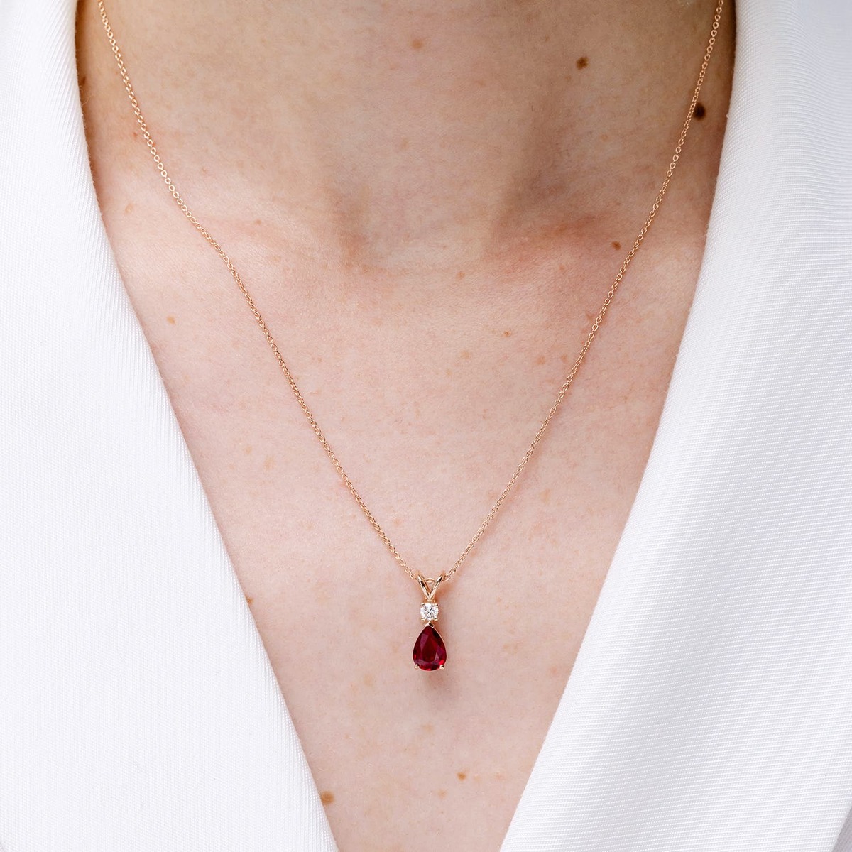 This classic solitaire pendant features a pear-shaped ruby secured in a prong setting. A brilliant round diamond sits atop the purplish red gemstone. Simple yet alluring, this ruby pendant in 14k solid gold is crafted with a lustrous v-bale.This Ruby necklace is crafted in Solid Gold ? a stunning choice for lovers of fine Ruby jewelry. Every item comes with an Angara Certificate of Authenticity, which will be sent to you via messages or with the package.