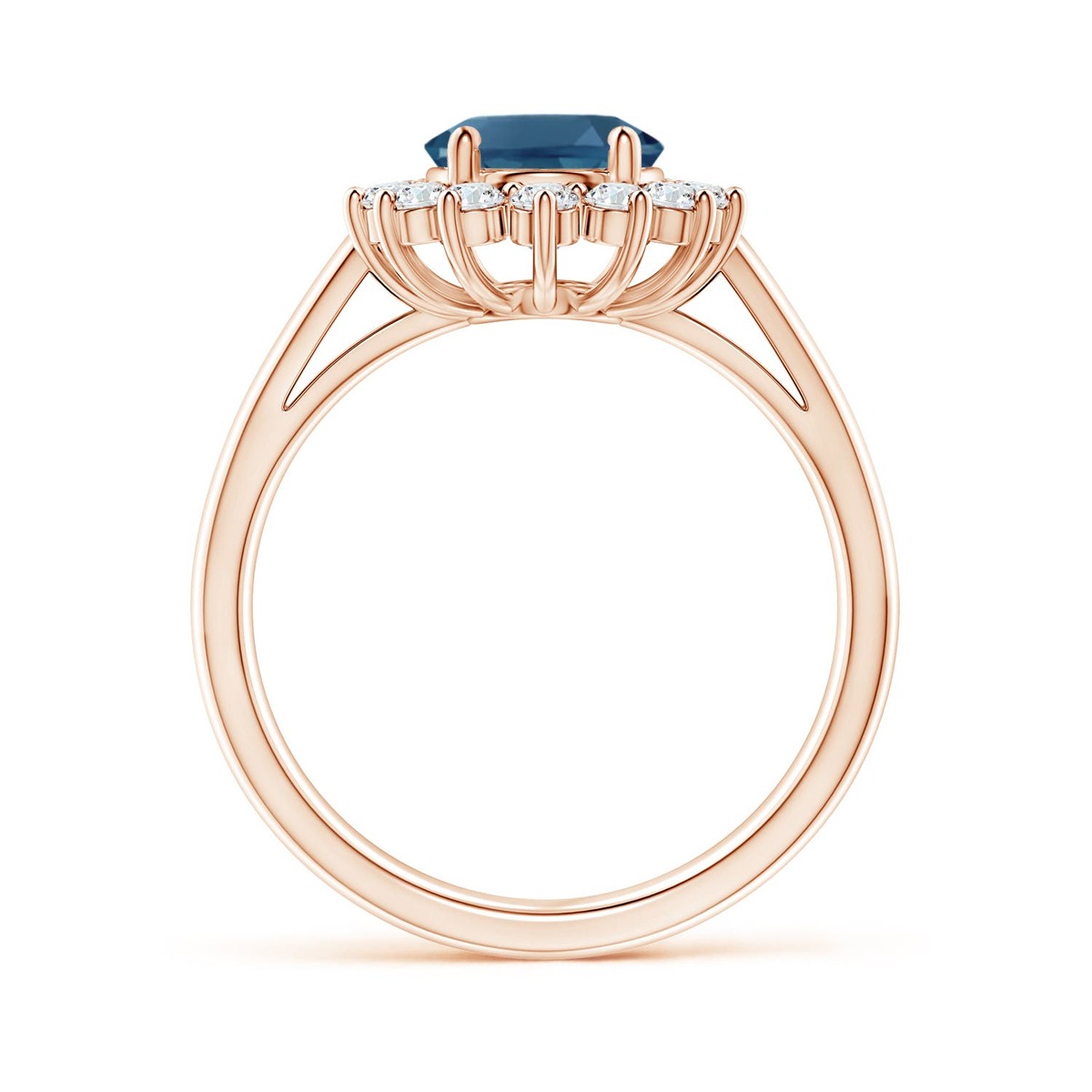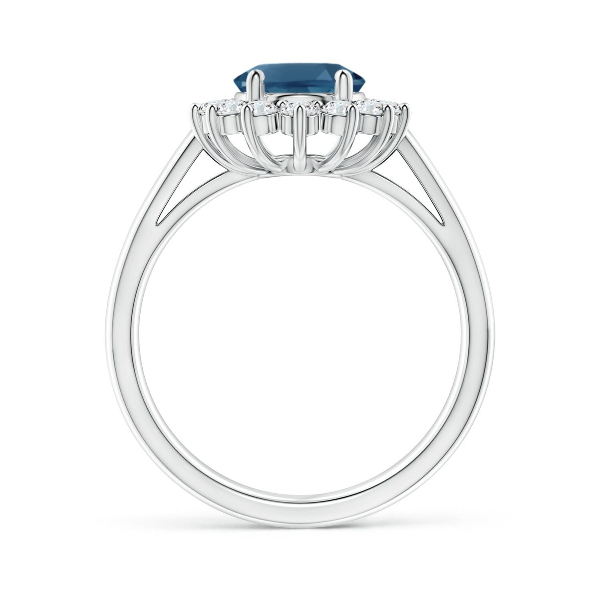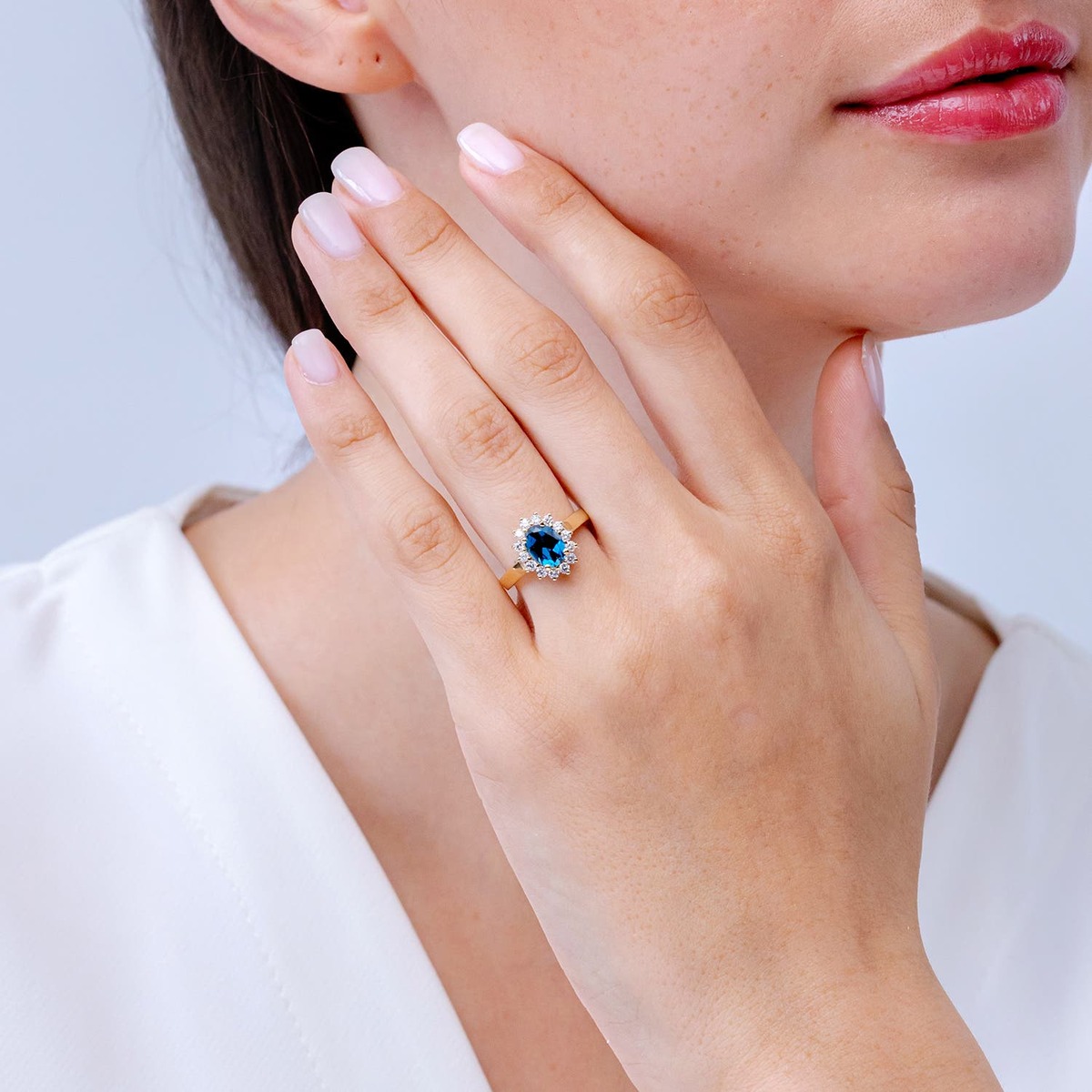 The design of this fascinating London blue topaz ring is inspired by Princess Diana's beautiful engagement ring. An oval prong set London blue topaz sits majestically at the core of a floral halo of diamonds. The diamonds enhance the beauty of the greenish blue gemstone. Sculpted in 14K Solid Gold, this London blue topaz ring with diamond halo bespeaks royalty and glamour.
