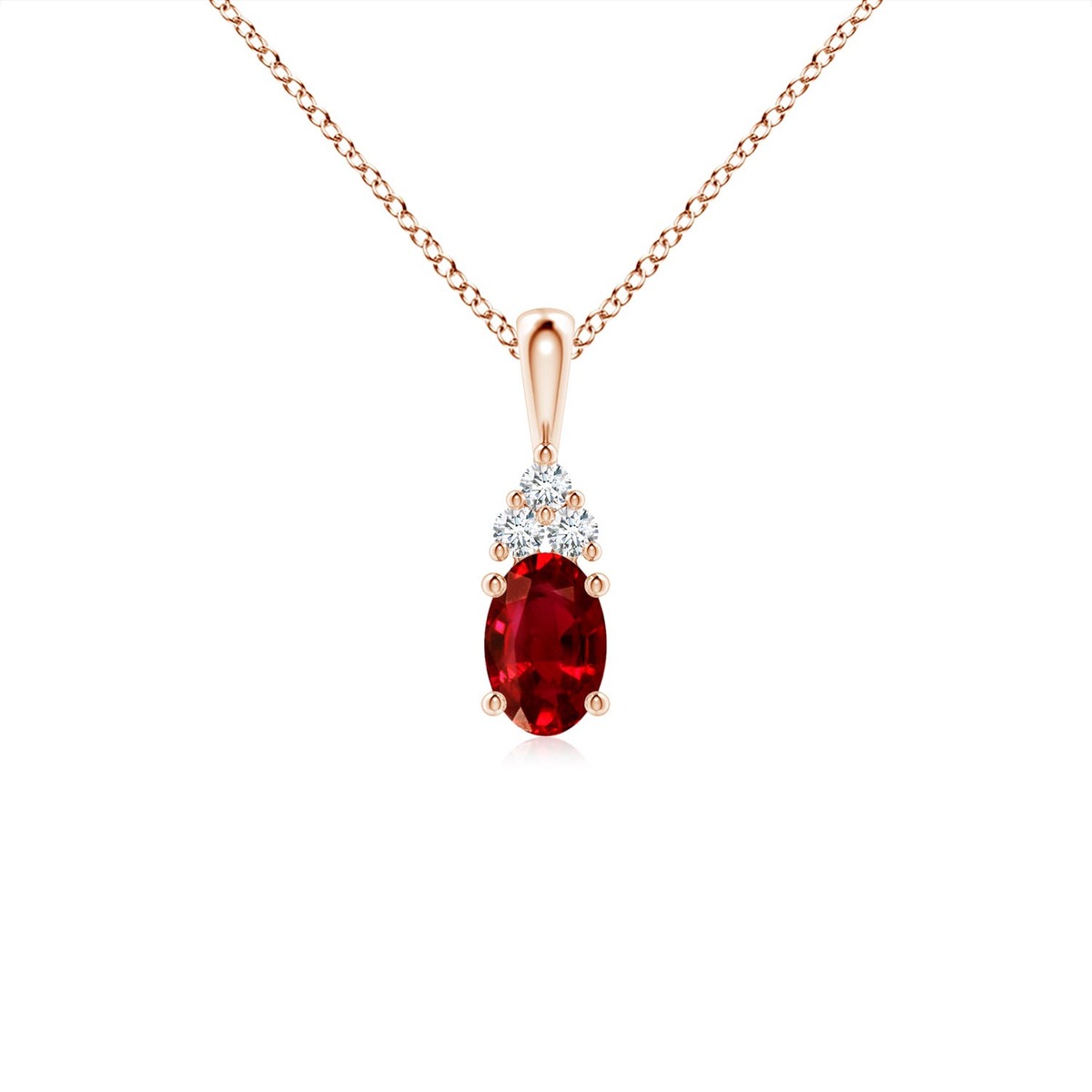 Capturing attention with its vibrant red hue is the oval ruby in a prong setting. It is topped by a trio of round diamonds and linked to a shiny V bale. This elegant pendant is crafted in 14k solid gold.This Ruby necklace is crafted in Solid Gold ? a stunning choice for lovers of fine Ruby jewelry. Every item comes with an Angara Certificate of Authenticity, which will be sent to you via messages or with the package.