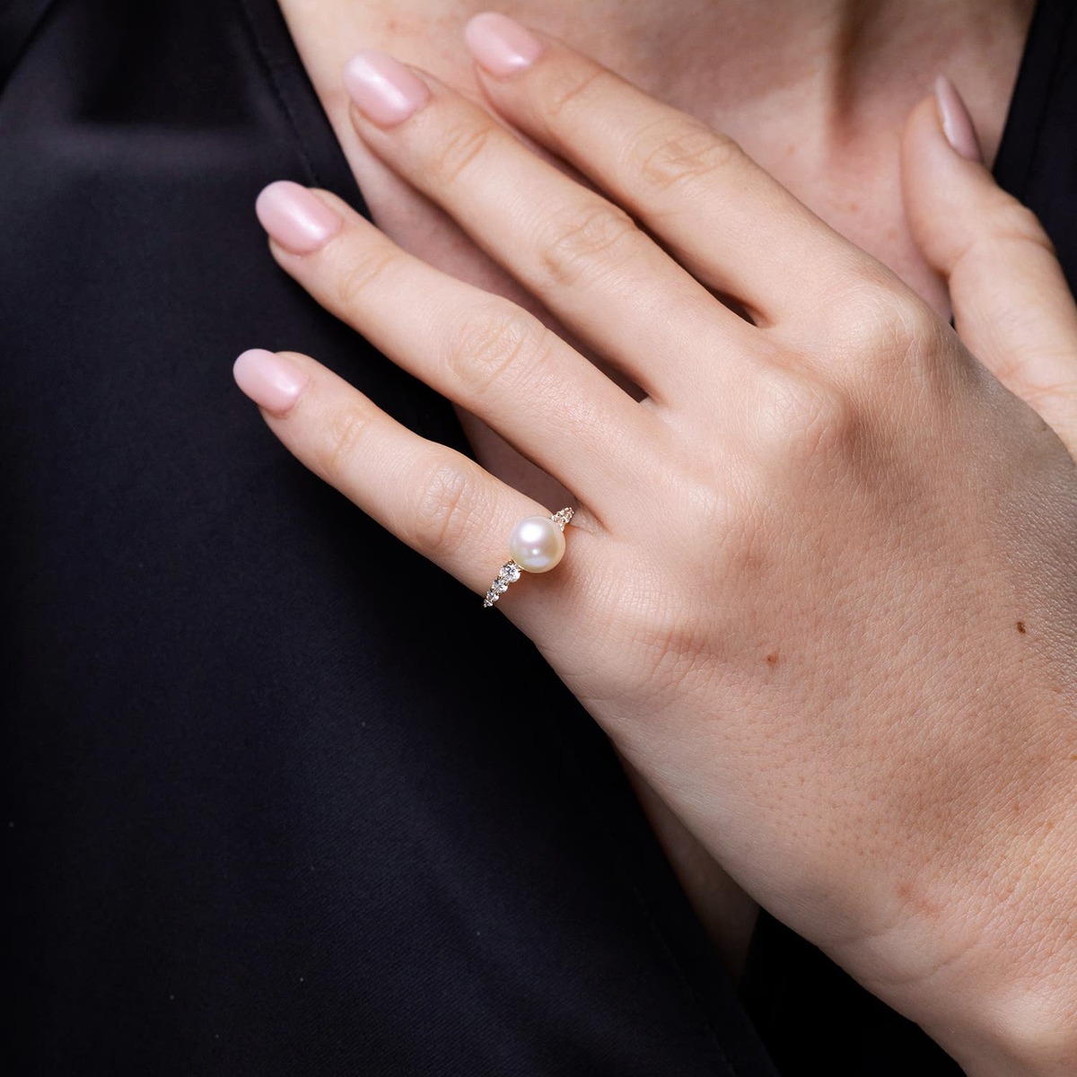 The Freshwater cultured pearl is set on a diamond studded shank. Dazzling endlessly, the prong-set diamonds are arranged in a graduating pattern on this 14K Solid Gold pearl ring.