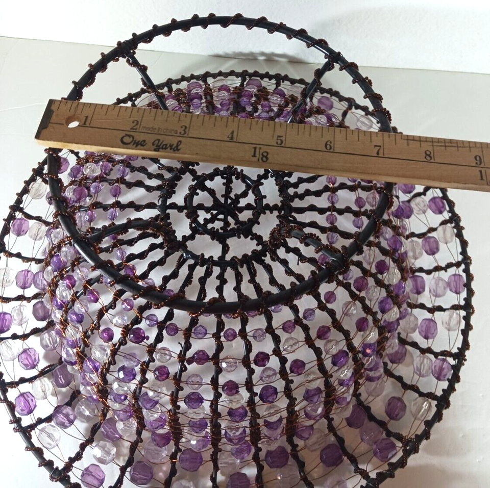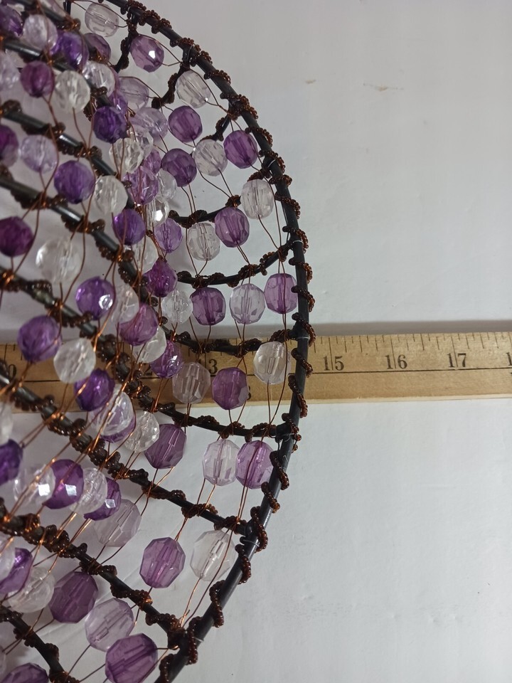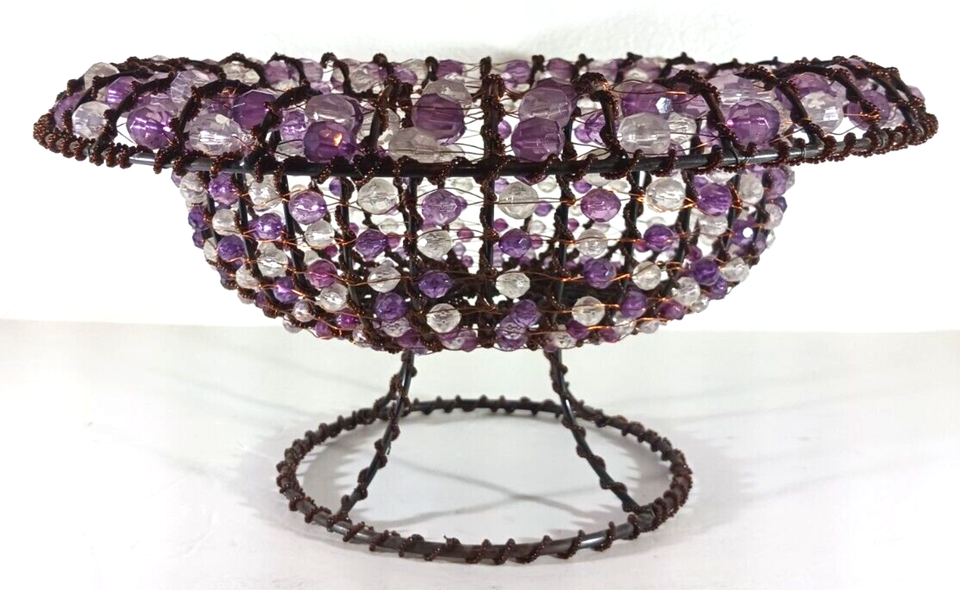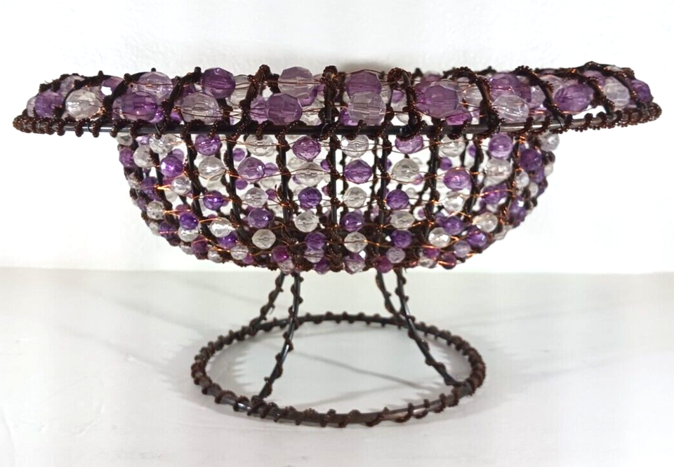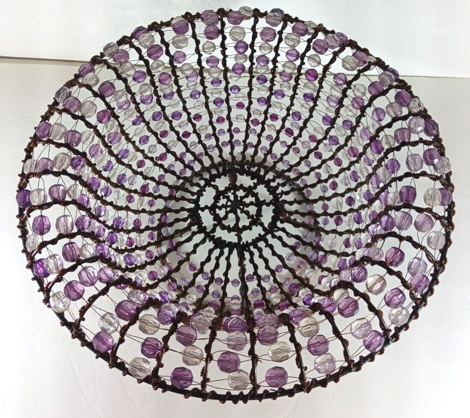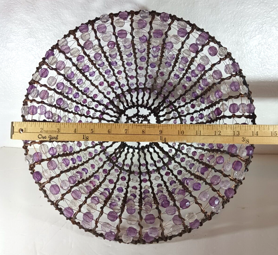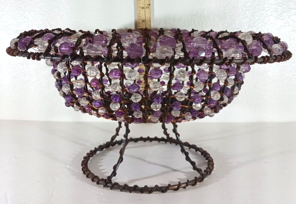 Handmade Extra Lg BEADED METAL WIRE CONSOLE BOWL Basket Purple Beads Footed 15"