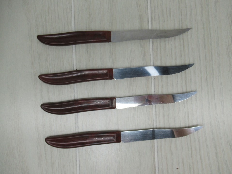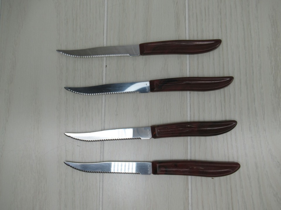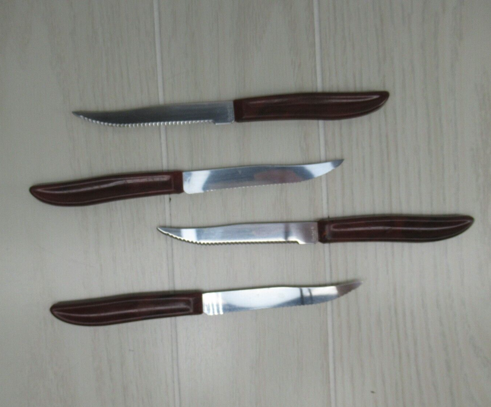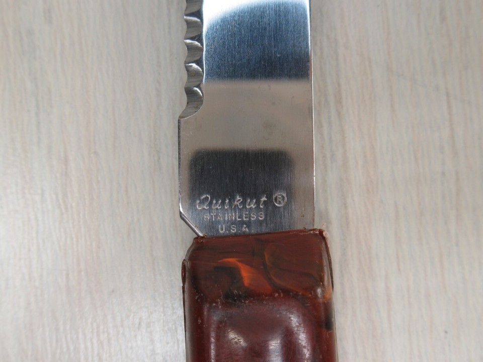 Quikut Stainless Steel 4 Vintage Serrated Steak Knives USA Brown Swirl Handles